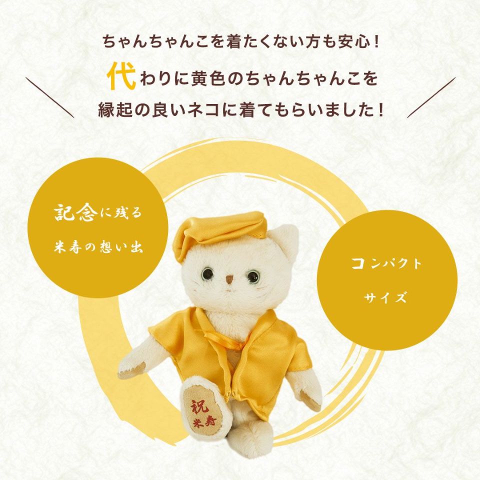 ちゃんちゃんこを着るのは恥ずかしい方もこれで安心! 「代わりにちゃんちゃんこをお祝いネコに着てもらったよ!」 ちゃんちゃんこを着た米寿ネコがお祝いの気持ちをお届けします。