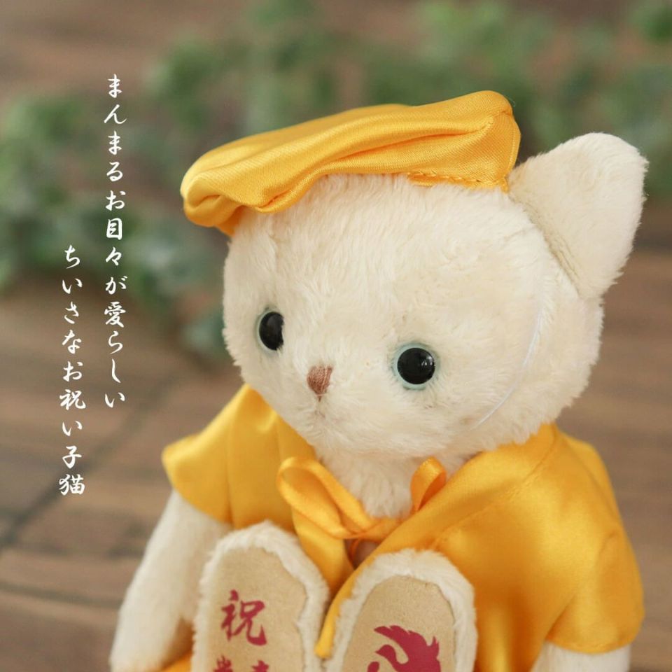 黄色いちゃんちゃんこを着て、金屏風の前に座ったかわいい子猫。 華やかさに楽しさを加えた米寿ネコが、大切な方の米寿を華やかにお祝いします。