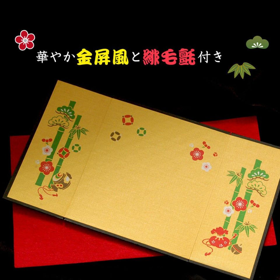 縁起の良い「松竹梅」をあしらった華やかな金屏風と毛氈付き。 黃色の座布団にお祝いネコを座らせてお飾り下さい。