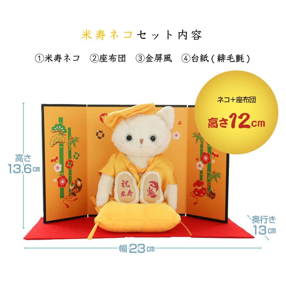 プレゼントとして贈った後は、米寿ネコと一緒に記念撮影すれば、家族の大切な想い出となることでしょう。 お祝いが終わった後も、インテリアとしてお楽しみいただけます。 場所をとらない飾りやすいコンパクトサイズなので、玄関やお部屋など家族やお友達との楽しいお祝いの思い出をいつも近くに飾っておくことができます。