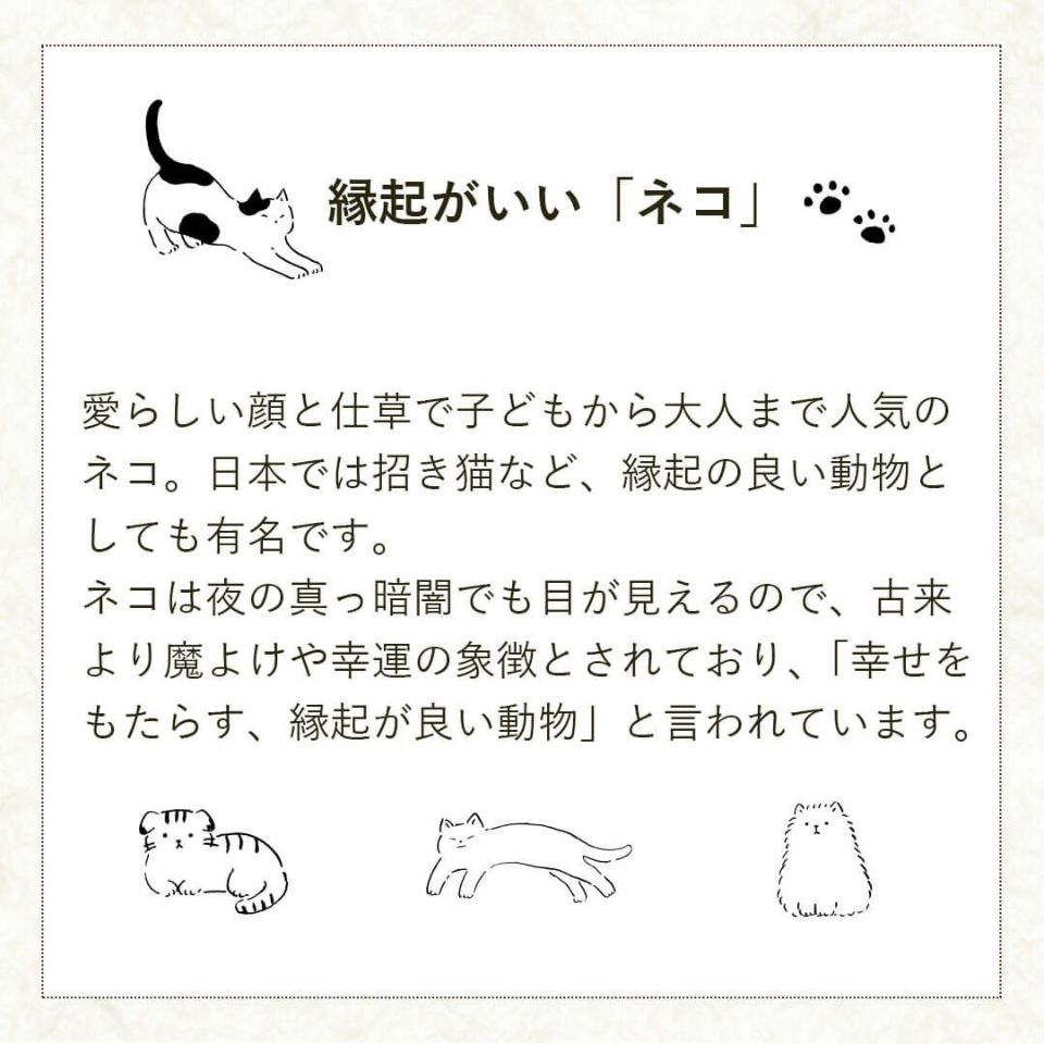 愛らしい顔と仕草で子どもから大人まで人気のネコ。 日本では招き猫など、縁起の良い動物としても有名です。 ネコは夜の真っ暗闇でも目が見えるので、古来より魔よけや幸運の象徴とされており、「幸せをもたらす、縁起が良い動物」と言われています。
