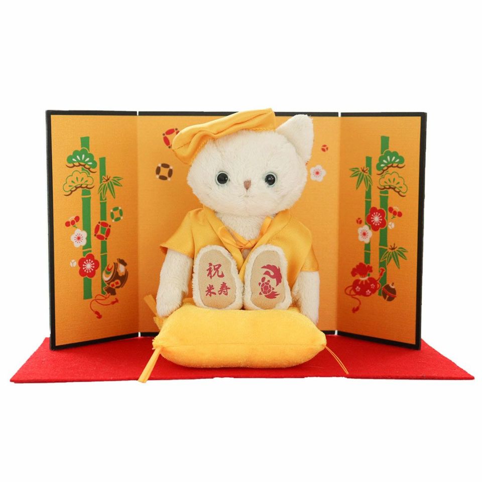 黄色いちゃんちゃんこを着て、金屏風の前に座ったかわいい子猫。 華やかさに楽しさを加えた米寿ネコが、大切な方の米寿を華やかにお祝いします。