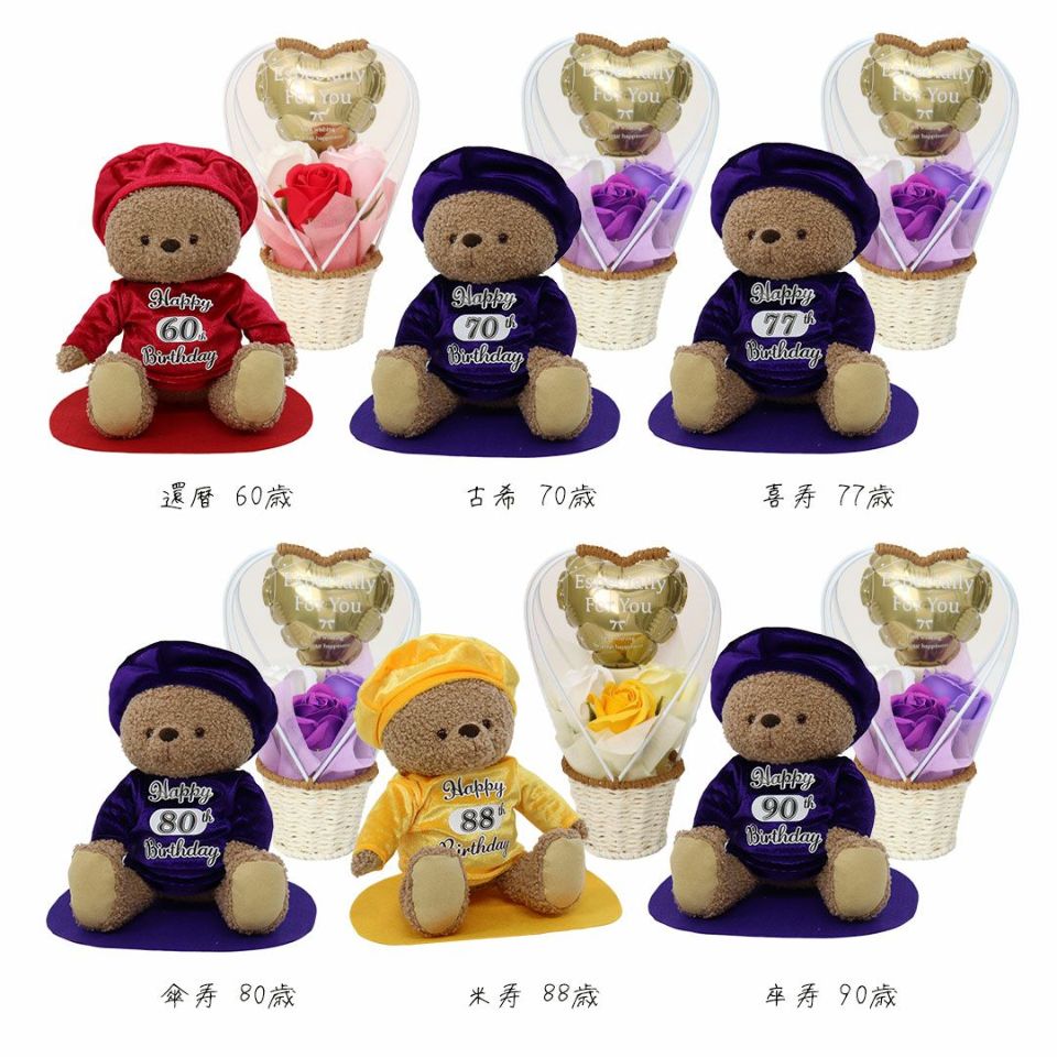 \ありがとうの気持ちをテディベアに込めて/ 人生の節目を華やかに祝う、長寿祝いの特別ギフト ずっとそばで見守ってくれているような、やさしい存在のテディベア。 共に過ごした日々を思い出しながら、感謝の気持ちを込めて贈る長寿祝いギフトです。 ■ おしゃれな記念日スタイル テディベアは、バースデーTシャツとベレー帽を着用。 節目の誕生日や敬老の日を、おしゃれに、そして印象深くお祝いします。 ■ 石けん素材の香るソープフラワー付き セットのお花は、華やかなフレグランスソープフラワー。 石鹸素材でできており、お手入れ不要で長く楽しめます。 ほのかに香るやさしい香りとともに、お部屋を彩ります。 ■ 飾って楽しめる専用ラグ付き ベア専用のミニラグ付きで、玄関やリビングに飾っても絵になります。 お孫さんとの会話のきっかけにもなり、「ここに座らせてね」と 自然に大切にする習慣が育まれる、心あたたまる工夫です。 ■ 贈り物としても嬉しいポイント ・ベアがTシャツ&ベレー帽でお祝い仕様 ・色鮮やかなフレグランスソープフラワー付き ・飾りやすい専用ラグ付き ・お部屋のアクセント&香りも楽しめる ・節目の誕生日、還暦・古希・喜寿・米寿などの長寿祝いにおすすめ 大切な方の記念日を、思い出深く、心あたたかく。 ぬいぐるみ専門店のこだわりが詰まった、上質な長寿祝いギフトです。