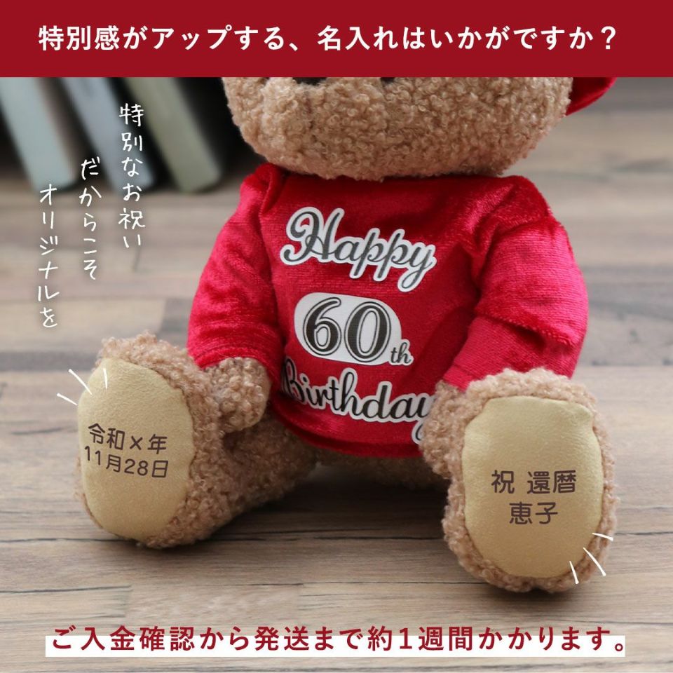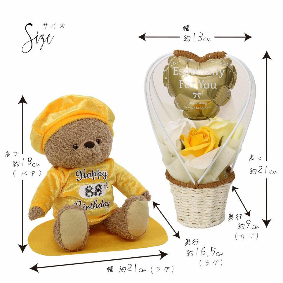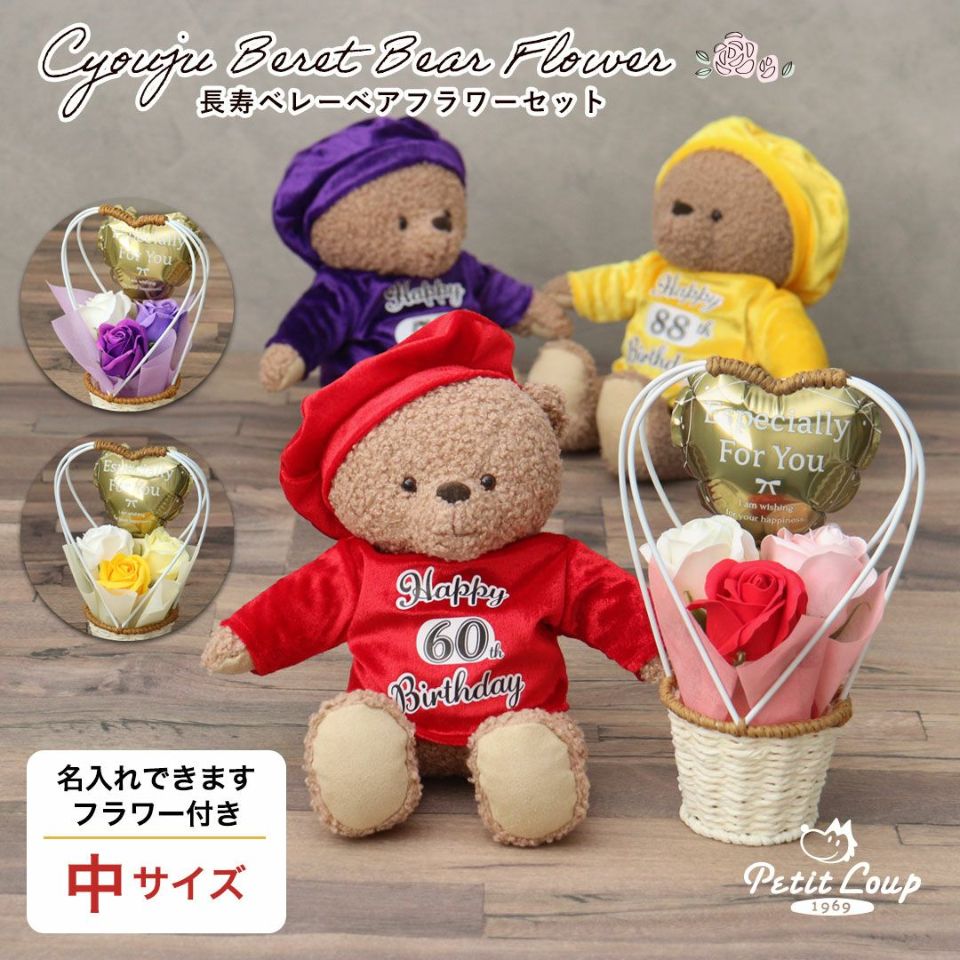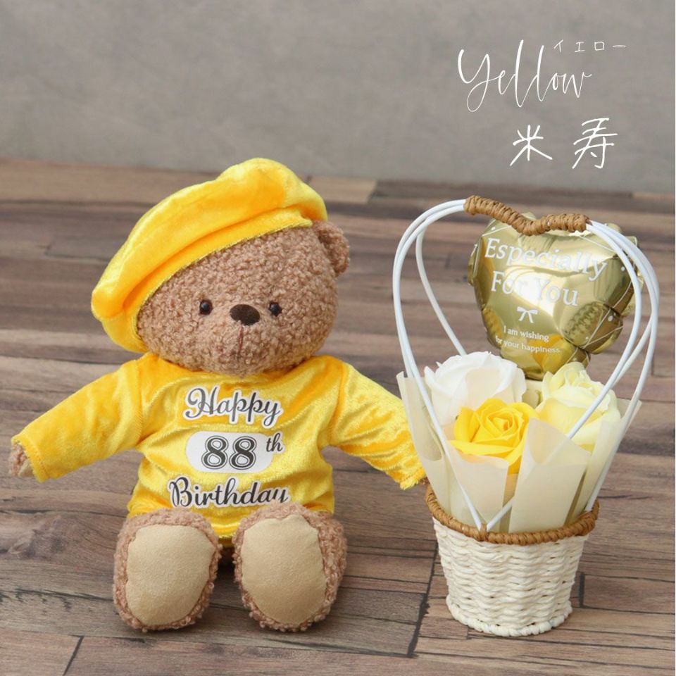 \ありがとうの気持ちをテディベアに込めて/ 人生の節目を華やかに祝う、長寿祝いの特別ギフト ずっとそばで見守ってくれているような、やさしい存在のテディベア。 共に過ごした日々を思い出しながら、感謝の気持ちを込めて贈る長寿祝いギフトです。 ■ おしゃれな記念日スタイル テディベアは、バースデーTシャツとベレー帽を着用。 節目の誕生日や敬老の日を、おしゃれに、そして印象深くお祝いします。 ■ 石けん素材の香るソープフラワー付き セットのお花は、華やかなフレグランスソープフラワー。 石鹸素材でできており、お手入れ不要で長く楽しめます。 ほのかに香るやさしい香りとともに、お部屋を彩ります。 ■ 飾って楽しめる専用ラグ付き ベア専用のミニラグ付きで、玄関やリビングに飾っても絵になります。 お孫さんとの会話のきっかけにもなり、「ここに座らせてね」と 自然に大切にする習慣が育まれる、心あたたまる工夫です。 ■ 贈り物としても嬉しいポイント ・ベアがTシャツ&ベレー帽でお祝い仕様 ・色鮮やかなフレグランスソープフラワー付き ・飾りやすい専用ラグ付き ・お部屋のアクセント&香りも楽しめる ・節目の誕生日、還暦・古希・喜寿・米寿などの長寿祝いにおすすめ 大切な方の記念日を、思い出深く、心あたたかく。 ぬいぐるみ専門店のこだわりが詰まった、上質な長寿祝いギフトです。