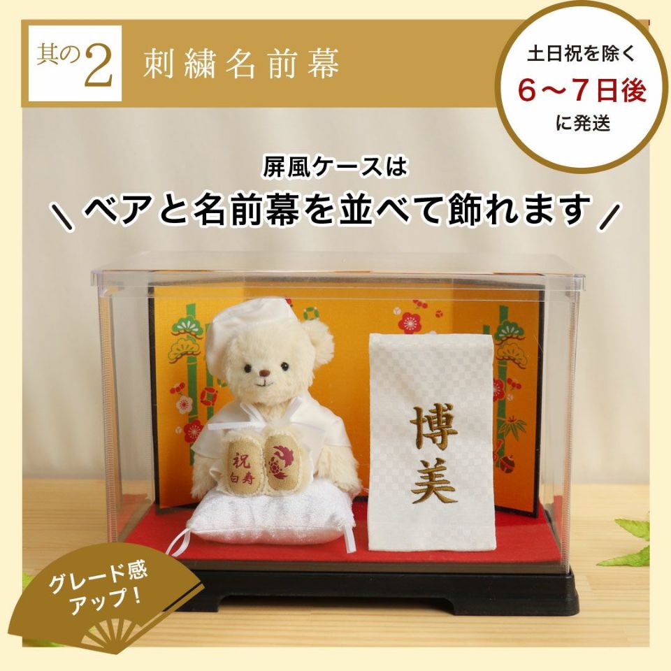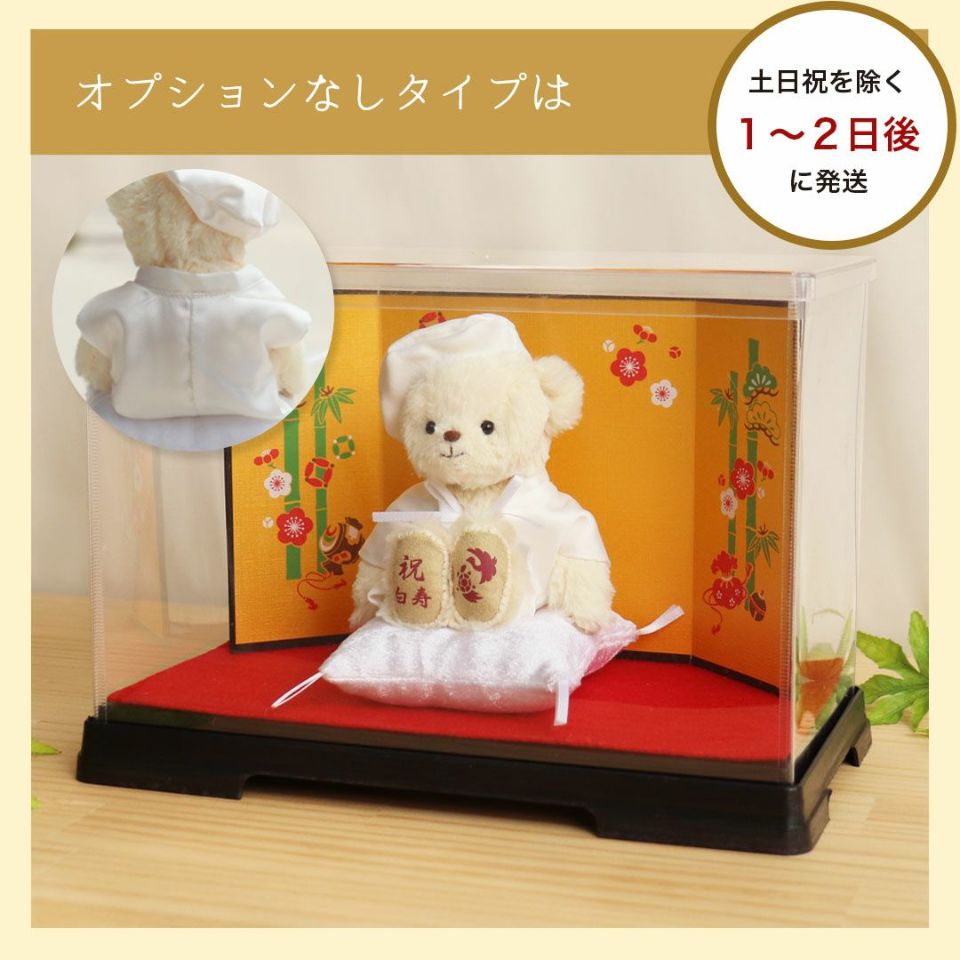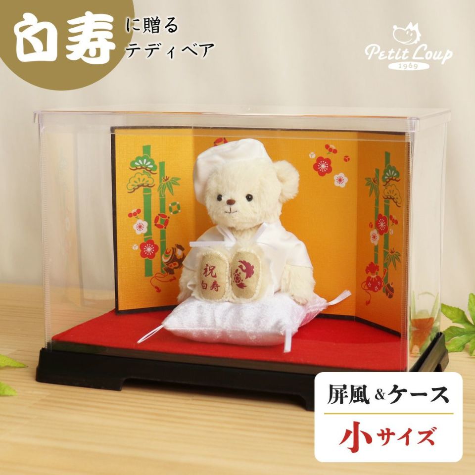 白寿(99歳)を迎えるご長寿のおじいちゃんおばあちゃんへ! かわいい表情の当店人気No.1テディベア。白のちゃんちゃんこを着てちょこんとお座り!玄関などに気兼ねなく飾れるちょうどいいコンパクトサイズなのも魅力のひとつ。 ホコリや汚れから守り、清潔に保てる金屏風付きケースセット。華やかな金屏風がより豪華な見栄えに。 しっかりとした赤いギフト箱に白寿専用の熨斗付きパッケージでそのままお渡しできます。特別な節目だからこそ、日頃の感謝を込めて家族で99歳のご長寿をお祝いしましょう。
