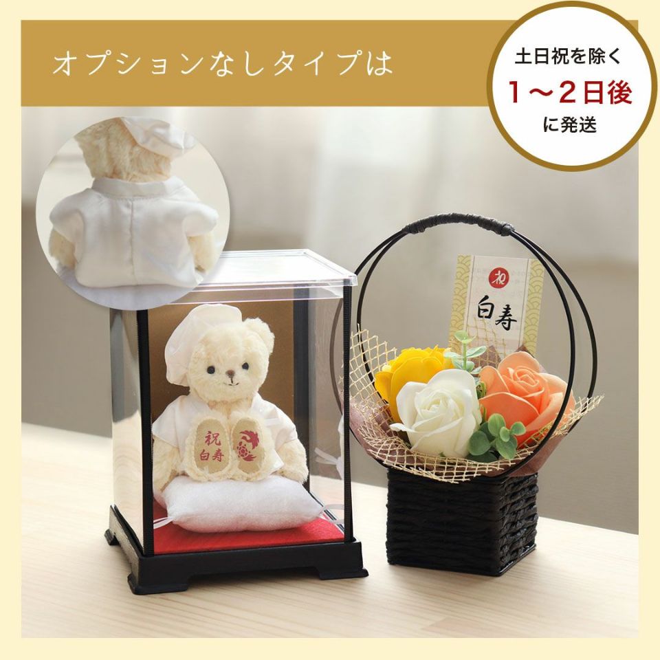 スタッフがご長寿ベアのちゃんちゃんこを脱がせて、大人気のコスチューム「おしゃれこぐま」を着せてみました。お祝いが終わった後もずっと楽しめるプティルウのご長寿ベアの魅力を是非ご覧ください。