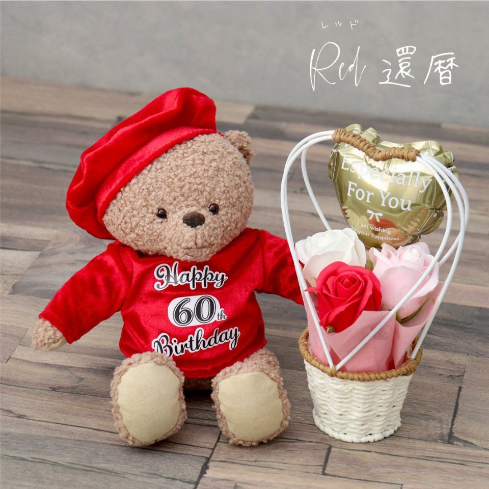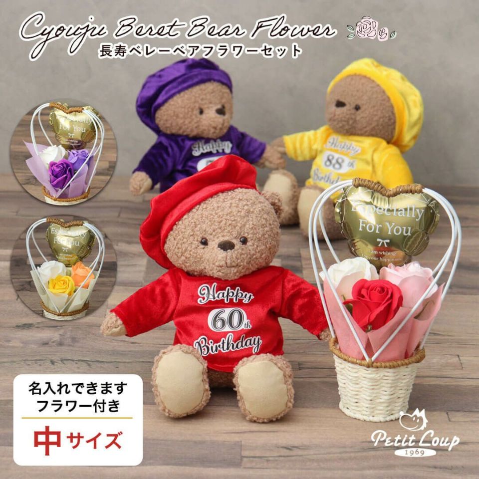 \ありがとうの気持ちをテディベアに込めて/ 人生の節目を華やかに祝う、長寿祝いの特別ギフト ずっとそばで見守ってくれているような、やさしい存在のテディベア。 共に過ごした日々を思い出しながら、感謝の気持ちを込めて贈る長寿祝いギフトです。 ■ おしゃれな記念日スタイル テディベアは、バースデーTシャツとベレー帽を着用。 節目の誕生日や敬老の日を、おしゃれに、そして印象深くお祝いします。 ■ 石けん素材の香るソープフラワー付き セットのお花は、華やかなフレグランスソープフラワー。 石鹸素材でできており、お手入れ不要で長く楽しめます。 ほのかに香るやさしい香りとともに、お部屋を彩ります。 ■ 飾って楽しめる専用ラグ付き ベア専用のミニラグ付きで、玄関やリビングに飾っても絵になります。 お孫さんとの会話のきっかけにもなり、「ここに座らせてね」と 自然に大切にする習慣が育まれる、心あたたまる工夫です。 ■ 贈り物としても嬉しいポイント ・ベアがTシャツ&ベレー帽でお祝い仕様 ・色鮮やかなフレグランスソープフラワー付き ・飾りやすい専用ラグ付き ・お部屋のアクセント&香りも楽しめる ・節目の誕生日、還暦・古希・喜寿・米寿などの長寿祝いにおすすめ 大切な方の記念日を、思い出深く、心あたたかく。 ぬいぐるみ専門店のこだわりが詰まった、上質な長寿祝いギフトです。
