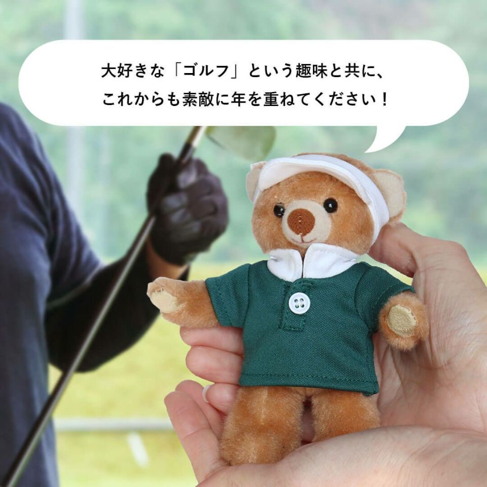 ゴルフが大好きなあの方へ。 これからも元気に、大好きな趣味と素敵な時間を── 「ゴルフ好き」に贈るご長寿祝いのテディベアです。 ■ 飾っても、持ち歩いても楽しめる ・しっかり自立するスタイリッシュな立ち姿 ・両手にマグネット入りで、写真やメッセージを飾れる ・ボールチェーン付きでキャディバッグにも装着可能 ■ 長寿祝いにふさわしい贈り物 還暦・古希・米寿などのお祝いに合わせた熨斗付きBOX入り。 そのままプレゼントとしてお渡しいただけます。 ゴルフと共に、これからの毎日がもっと輝きますように── 感謝と健康を願って贈る、特別なギフトです。