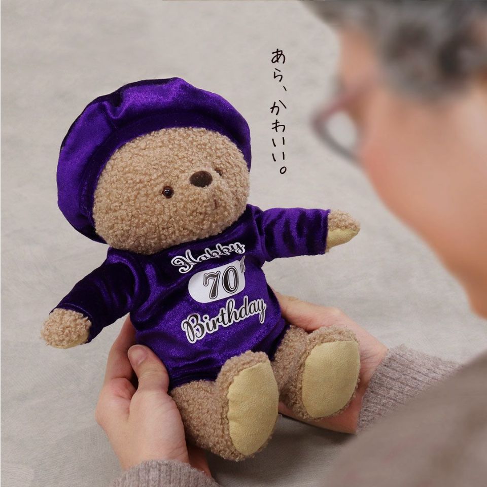\ありがとうの気持ちをテディベアに込めて/ 人生の節目を華やかに祝う、長寿祝いの特別ギフト ずっとそばで見守ってくれているような、やさしい存在のテディベア。 共に過ごした日々を思い出しながら、感謝の気持ちを込めて贈る長寿祝いギフトです。 ■ おしゃれな記念日スタイル テディベアは、バースデーTシャツとベレー帽を着用。 節目の誕生日や敬老の日を、おしゃれに、そして印象深くお祝いします。 ■ 石けん素材の香るソープフラワー付き セットのお花は、華やかなフレグランスソープフラワー。 石鹸素材でできており、お手入れ不要で長く楽しめます。 ほのかに香るやさしい香りとともに、お部屋を彩ります。 ■ 飾って楽しめる専用ラグ付き ベア専用のミニラグ付きで、玄関やリビングに飾っても絵になります。 お孫さんとの会話のきっかけにもなり、「ここに座らせてね」と 自然に大切にする習慣が育まれる、心あたたまる工夫です。 ■ 贈り物としても嬉しいポイント ・ベアがTシャツ&ベレー帽でお祝い仕様 ・色鮮やかなフレグランスソープフラワー付き ・飾りやすい専用ラグ付き ・お部屋のアクセント&香りも楽しめる ・節目の誕生日、還暦・古希・喜寿・米寿などの長寿祝いにおすすめ 大切な方の記念日を、思い出深く、心あたたかく。 ぬいぐるみ専門店のこだわりが詰まった、上質な長寿祝いギフトです。