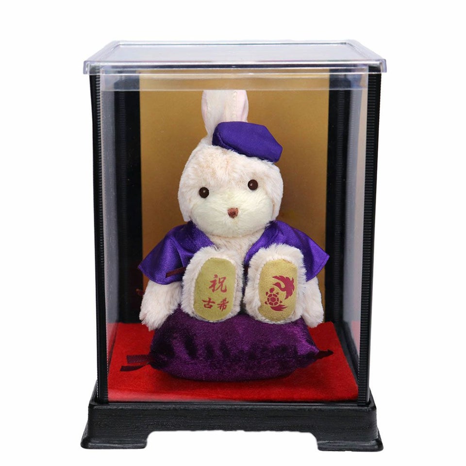 古希(70歳) 喜寿(77歳) 傘寿(80歳)卒寿(90歳)を迎える方へ! お祝いにふさわしい縁起の良い「うさぎ」。紫のちゃんちゃんこを着てちょこんとお座り!玄関などに気兼ねなく飾れるちょうどいいコンパクトサイズなのも魅力のひとつ。 ホコリや汚れから守り、清潔に保てるケース付き。背面が金張りになっている華やかな折りたたみ式プラスチックケース。 しっかりとした赤いギフト箱に古希・喜寿・傘寿・卒寿それぞれ専用の熨斗付きパッケージでそのままお渡しできます。特別な節目だからこそ、日頃の感謝を込めて家族でご長寿をお祝いしましょう。