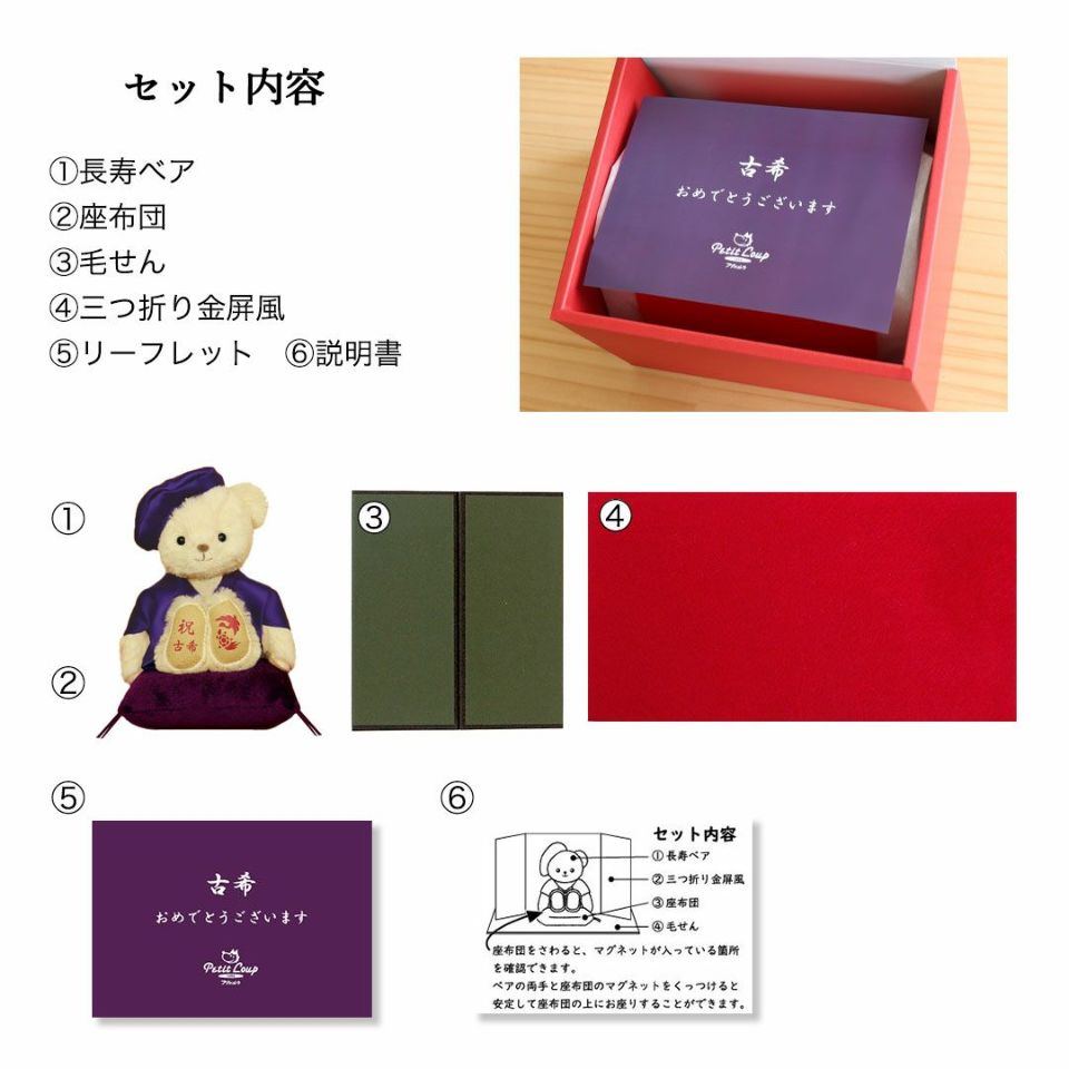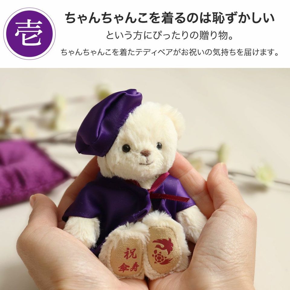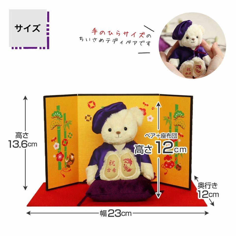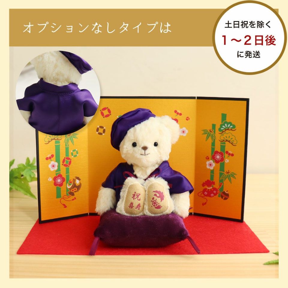 古希(70歳) 喜寿(77歳) 傘寿(80歳)卒寿(90歳)を迎える方へ! かわいい表情の当店人気No.1テディベア。紫のちゃんちゃんこを着てちょこんとお座り!玄関などに気兼ねなく飾れるちょうどいいコンパクトサイズなのも魅力のひとつ。 縁起の良い「松竹梅」をあしらった華やかな金屏風と毛氈付き。紫色の座布団に座らせてお飾り下さい。 しっかりとした赤いギフト箱に、古希・喜寿・傘寿・卒寿それぞれ専用の熨斗付きパッケージでそのままお渡しできます。特別な節目だからこそ、日頃の感謝を込めて家族でご長寿をお祝いしましょう。