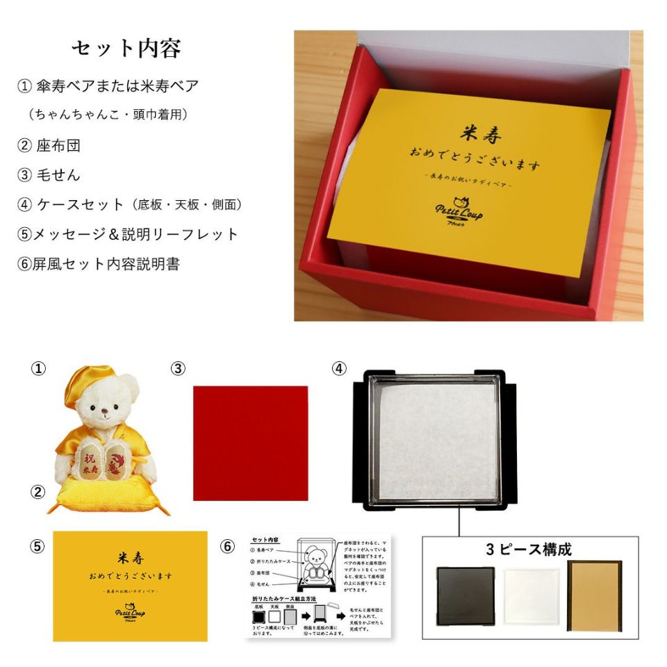 セット内容 べア(ちゃんちゃんこ・頭巾着用)、座布団、毛氈、折りたたみケースセット(底板/天板/側面の3ピース構成)