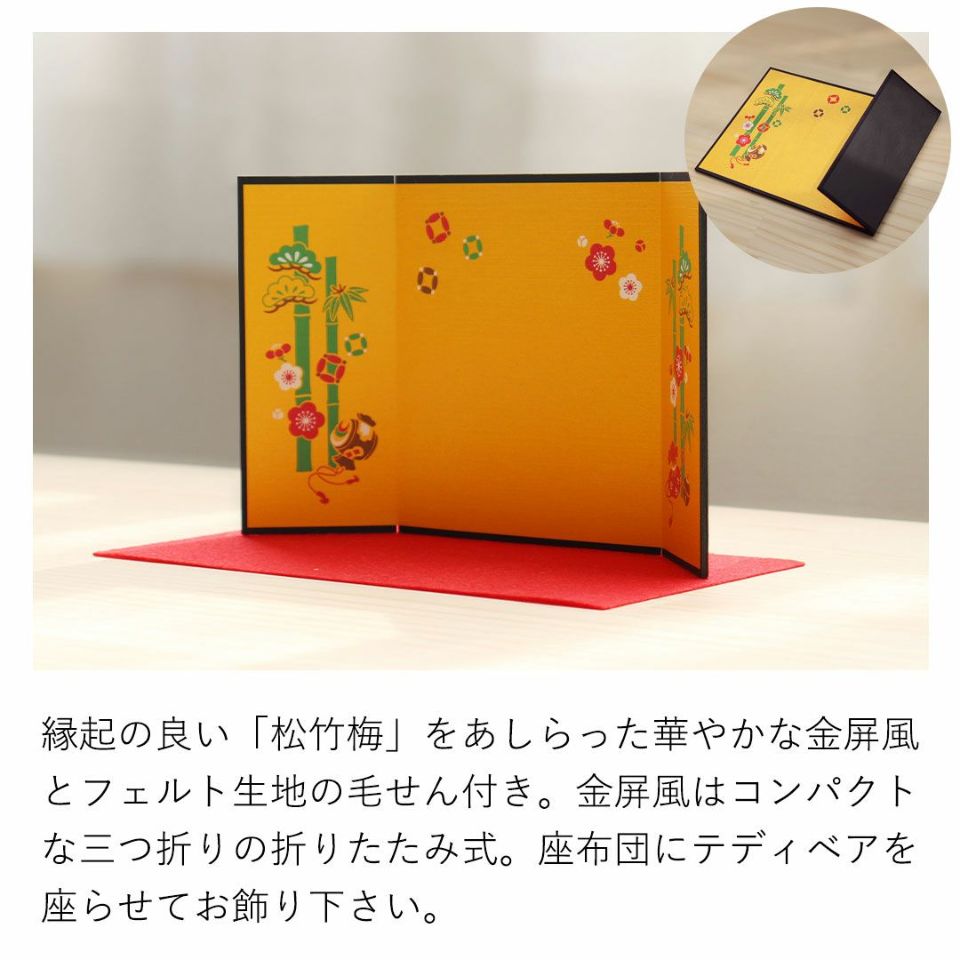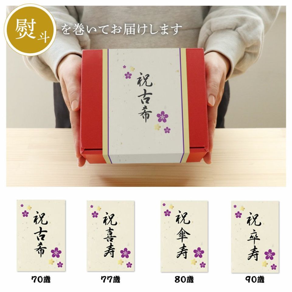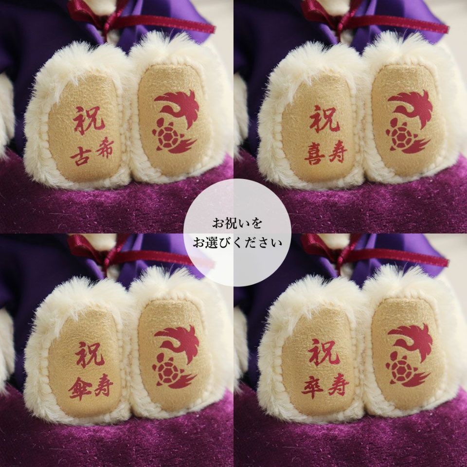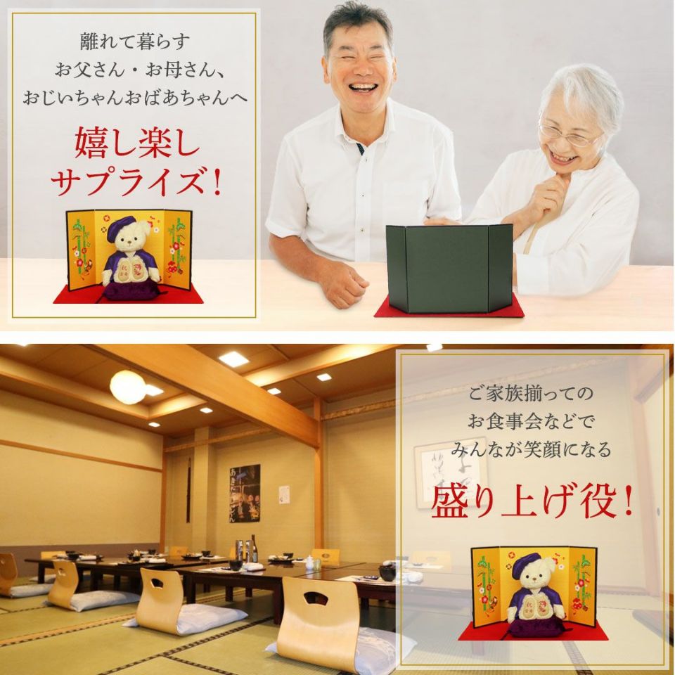 古希(70歳) 喜寿(77歳) 傘寿(80歳)卒寿(90歳)を迎える方へ! かわいい表情の当店人気No.1テディベア。紫のちゃんちゃんこを着てちょこんとお座り!玄関などに気兼ねなく飾れるちょうどいいコンパクトサイズなのも魅力のひとつ。 縁起の良い「松竹梅」をあしらった華やかな金屏風と毛氈付き。紫色の座布団に座らせてお飾り下さい。 しっかりとした赤いギフト箱に、古希・喜寿・傘寿・卒寿それぞれ専用の熨斗付きパッケージでそのままお渡しできます。特別な節目だからこそ、日頃の感謝を込めて家族でご長寿をお祝いしましょう。