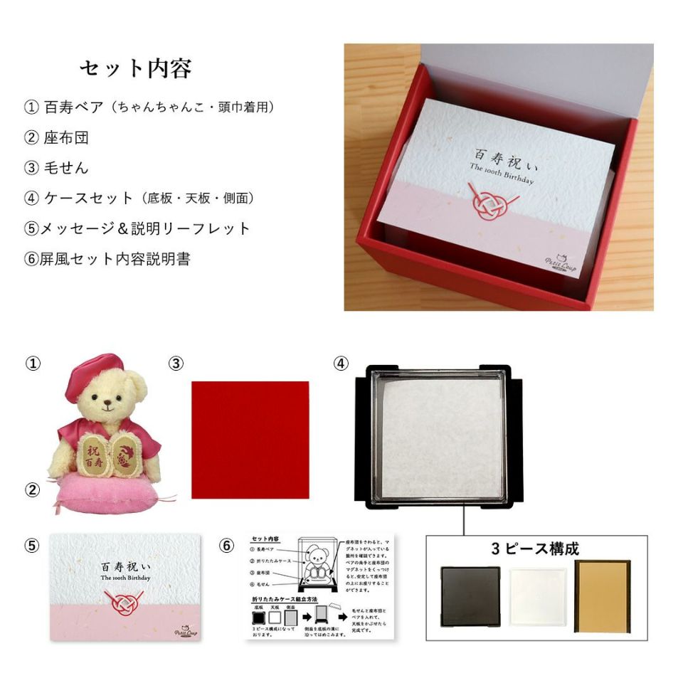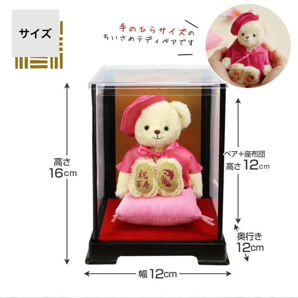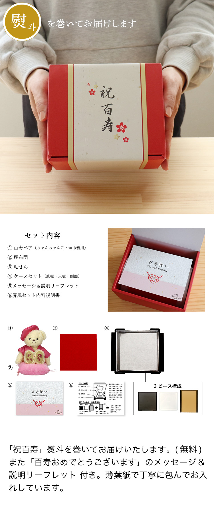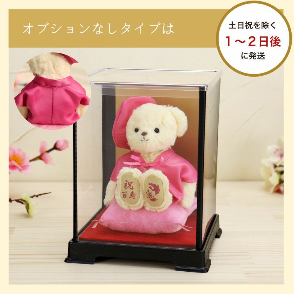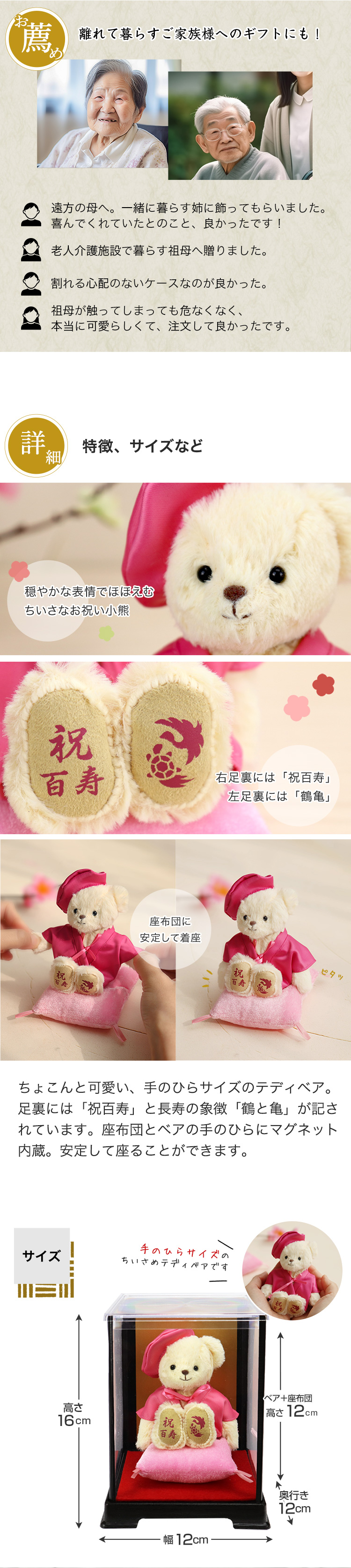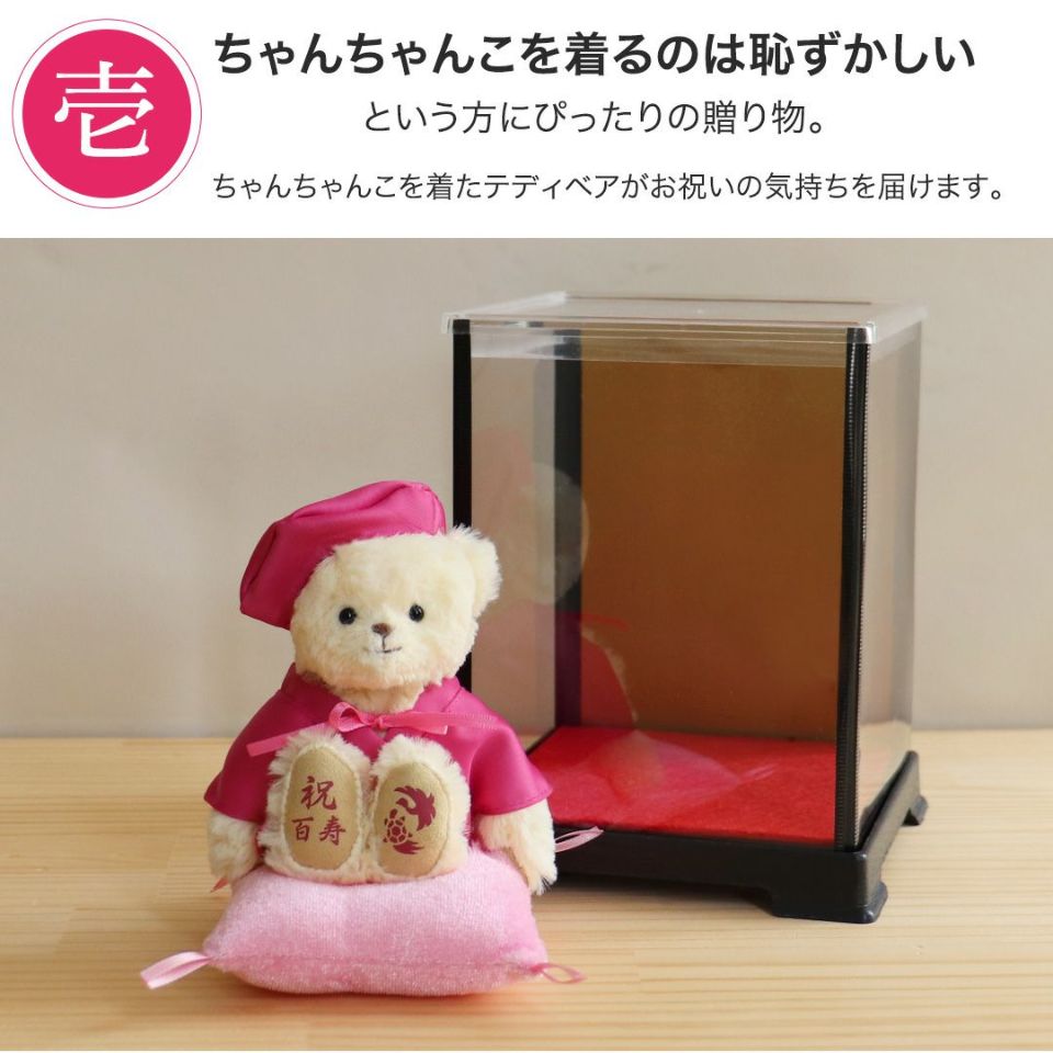 百寿(100歳)を迎えるご長寿のおじいちゃんおばあちゃんへ! かわいい表情の当店人気No.1テディベア。桃色のちゃんちゃんこを着てちょこんとお座り! 玄関などに気兼ねなく飾れるちょうどいいコンパクトサイズなのも魅力のひとつ。 ホコリや汚れから守り、清潔に保てるケース付き。背面が金張りになっている華やかな折りたたみ式プラスチックケース。 しっかりした赤いギフト箱に百寿専用の熨斗付きパッケージでそのままお渡しできます。特別な節目だからこそ、日頃の感謝を込めて家族で100歳のご長寿をお祝いしましょう。