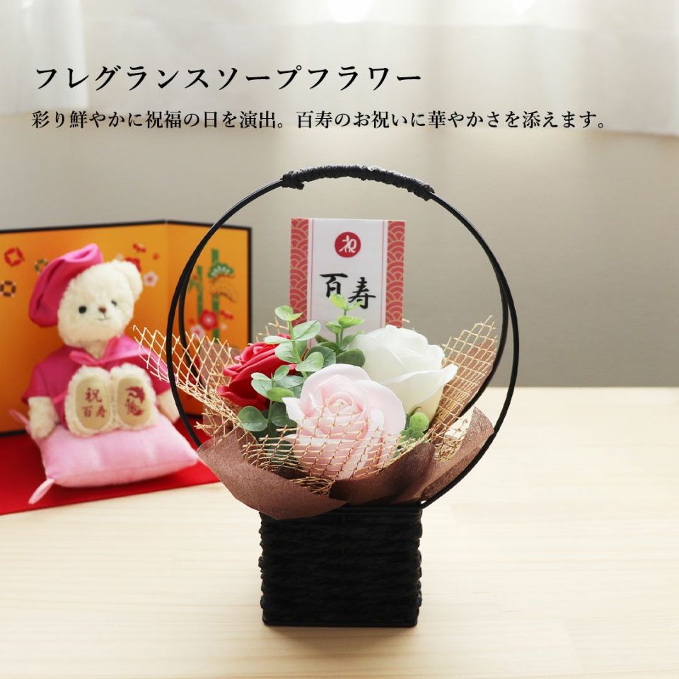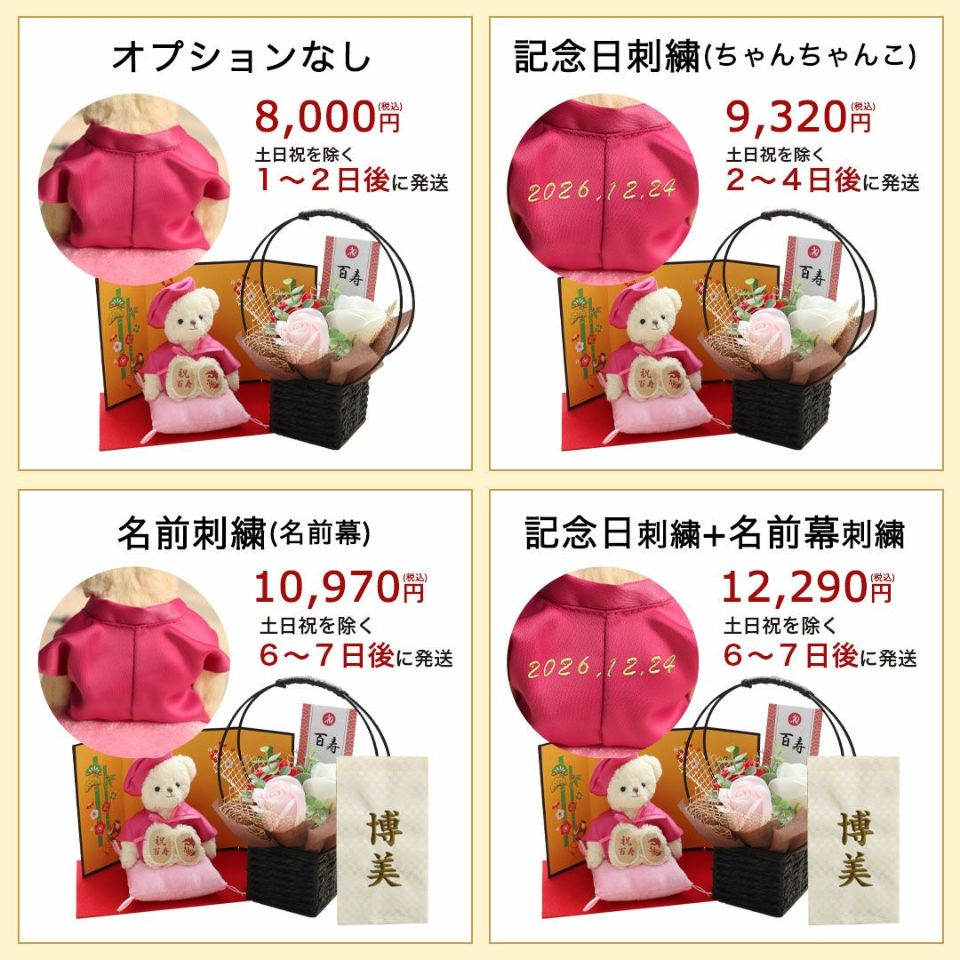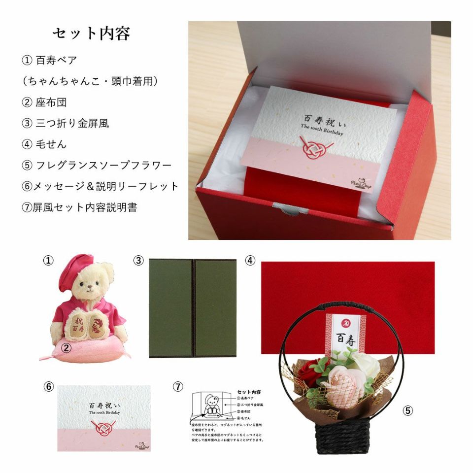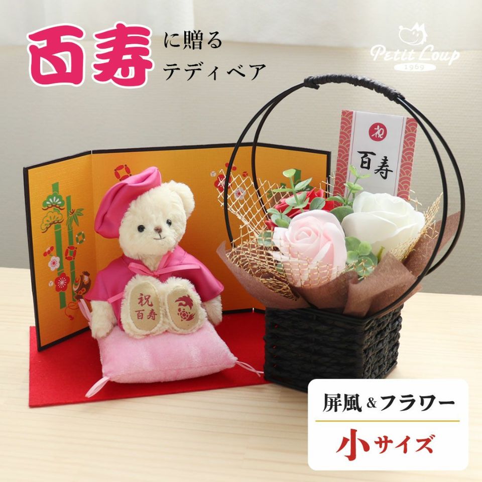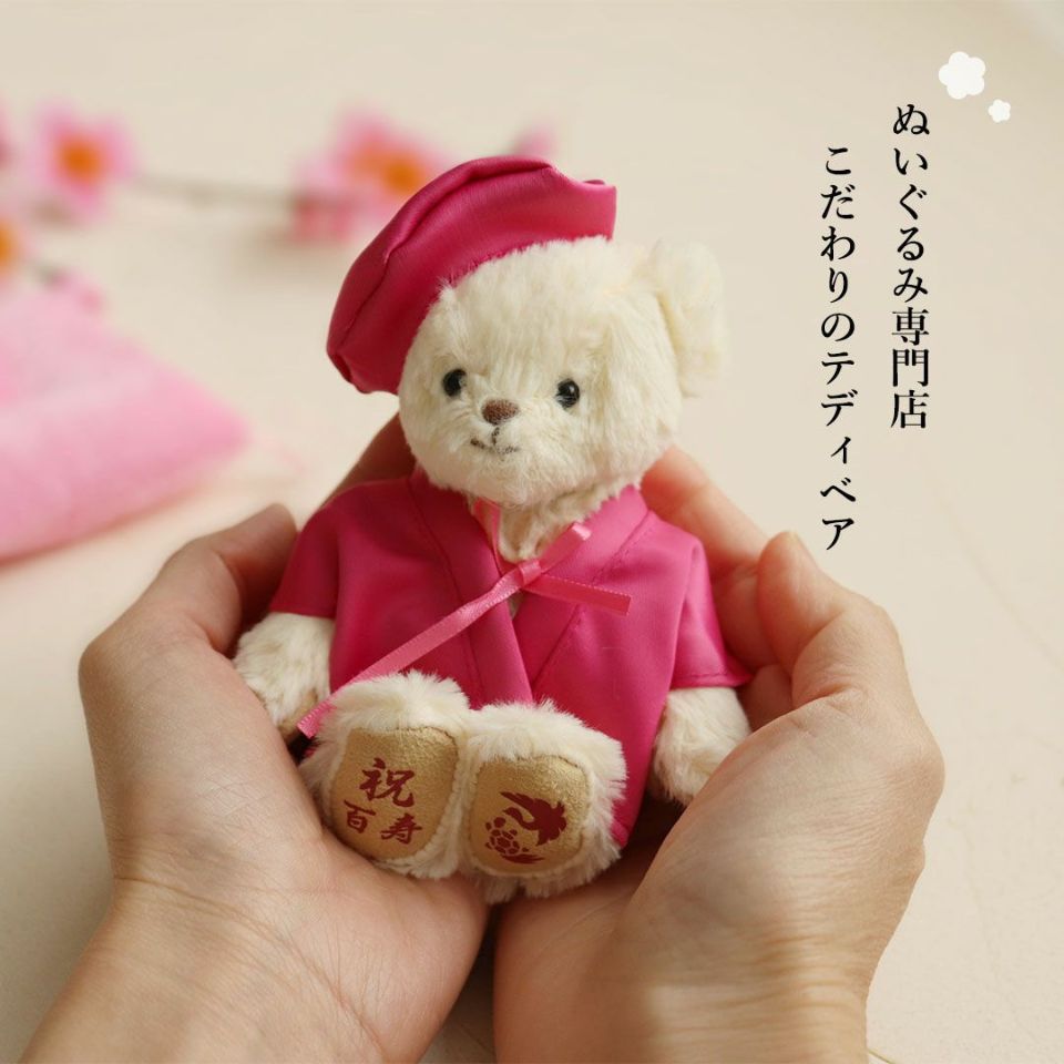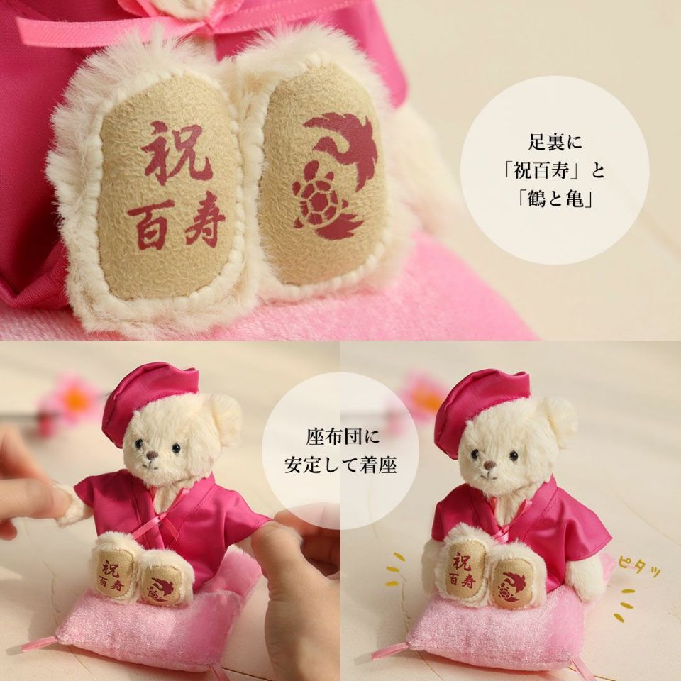 スタッフがご長寿ベアのちゃんちゃんこを脱がせて、大人気のコスチューム「おしゃれこぐま」を着せてみました。お祝いが終わった後もずっと楽しめるプティルウのご長寿ベアの魅力を是非ご覧ください。