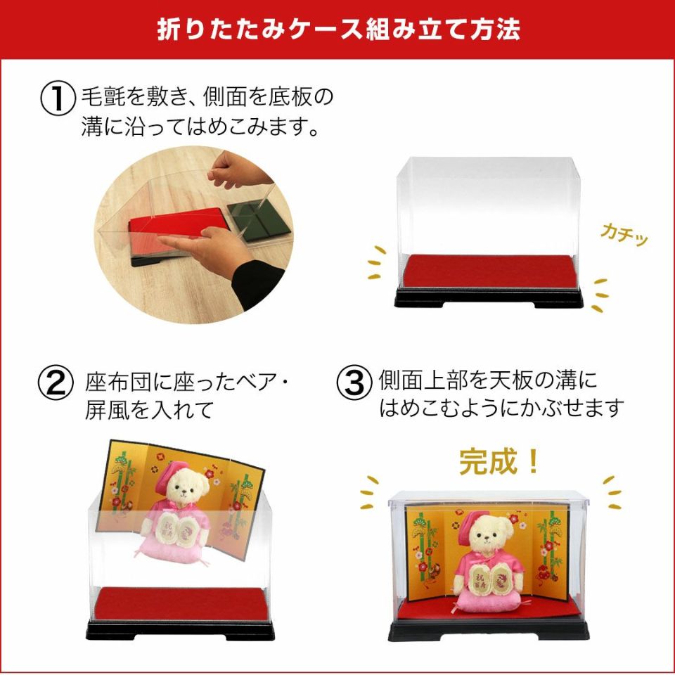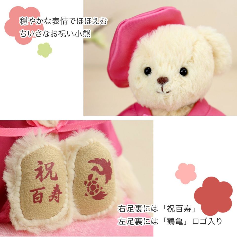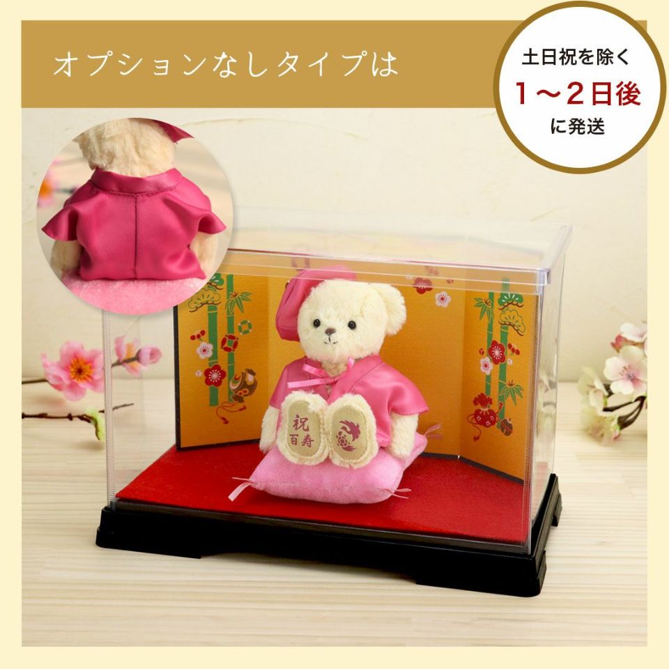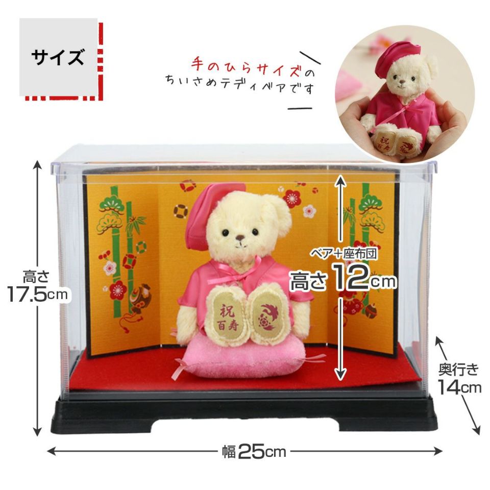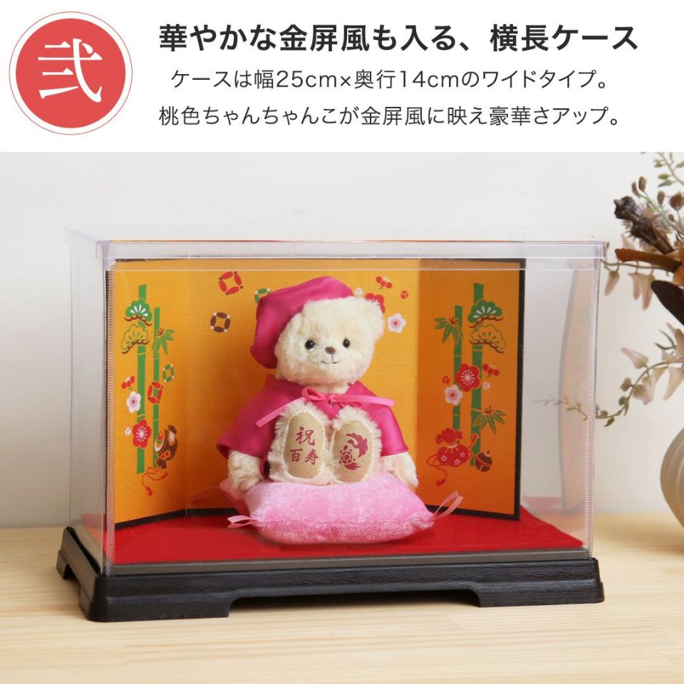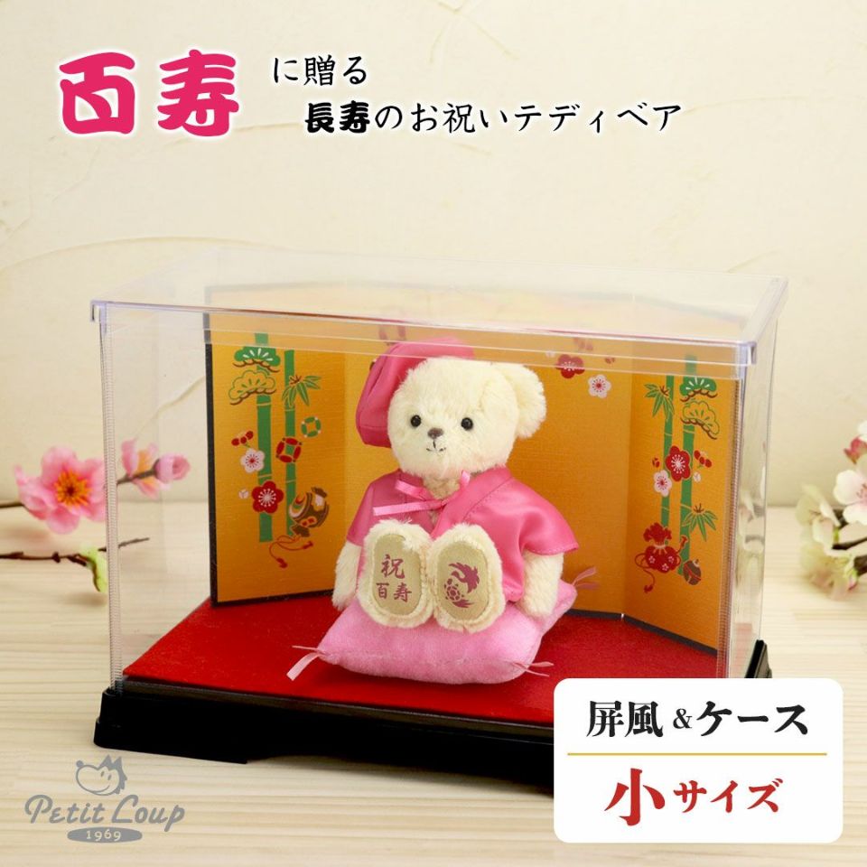 百寿(100歳)を迎えるご長寿のおじいちゃんおばあちゃんへ! かわいい表情の当店人気No.1テディベア。桃色のちゃんちゃんこを着てちょこんとお座り!玄関などに気兼ねなく飾れるちょうどいいコンパクトサイズなのも魅力のひとつ。 ホコリや汚れから守り、清潔に保てる金屏風付きケースセット。華やかな金屏風がより豪華な見栄えに。 しっかりとした赤いギフト箱に百寿専用の熨斗付きパッケージでそのままお渡しできます。特別な節目だからこそ、日頃の感謝を込めて家族で100歳のご長寿をお祝いしましょう。