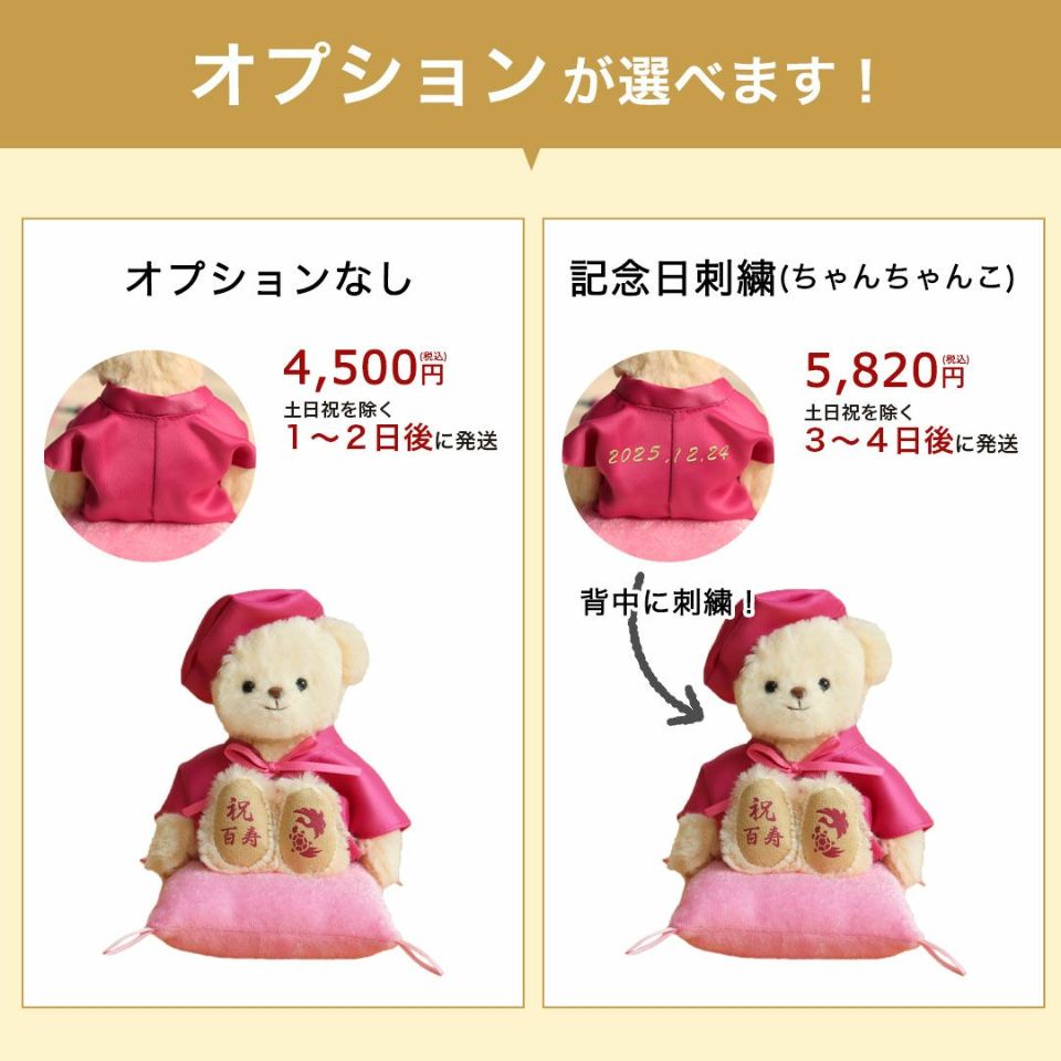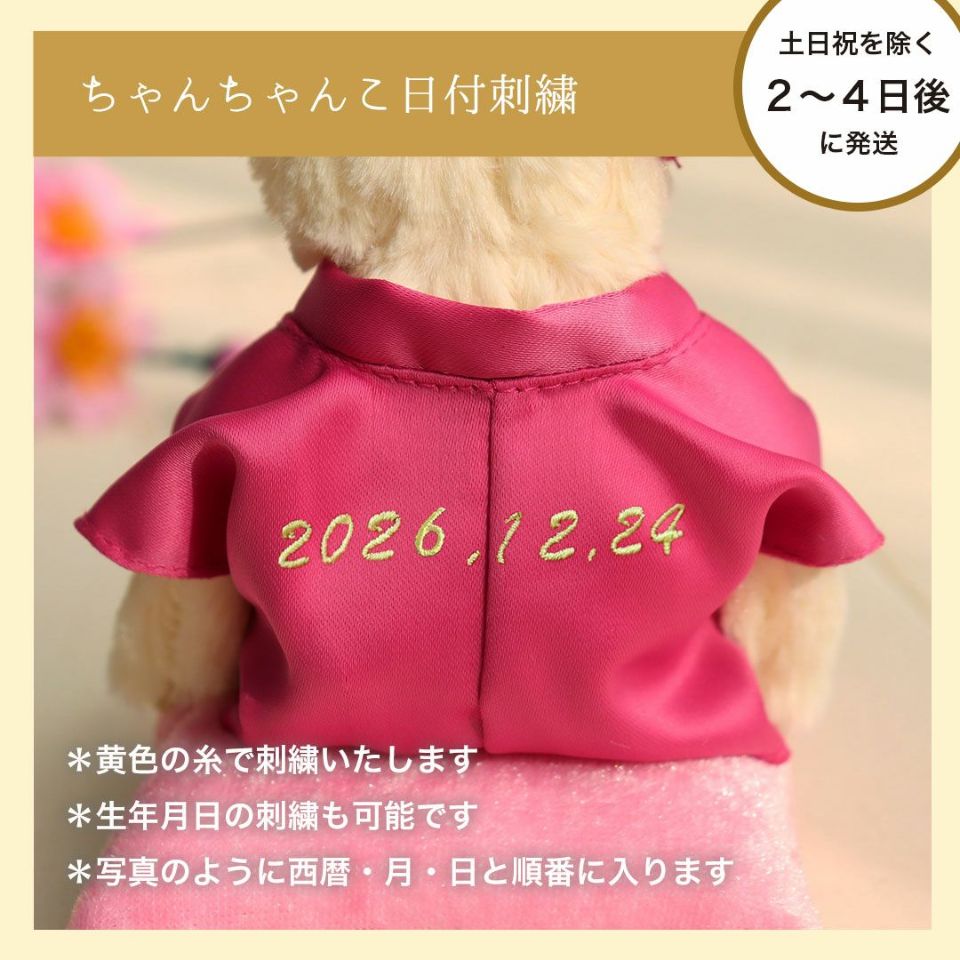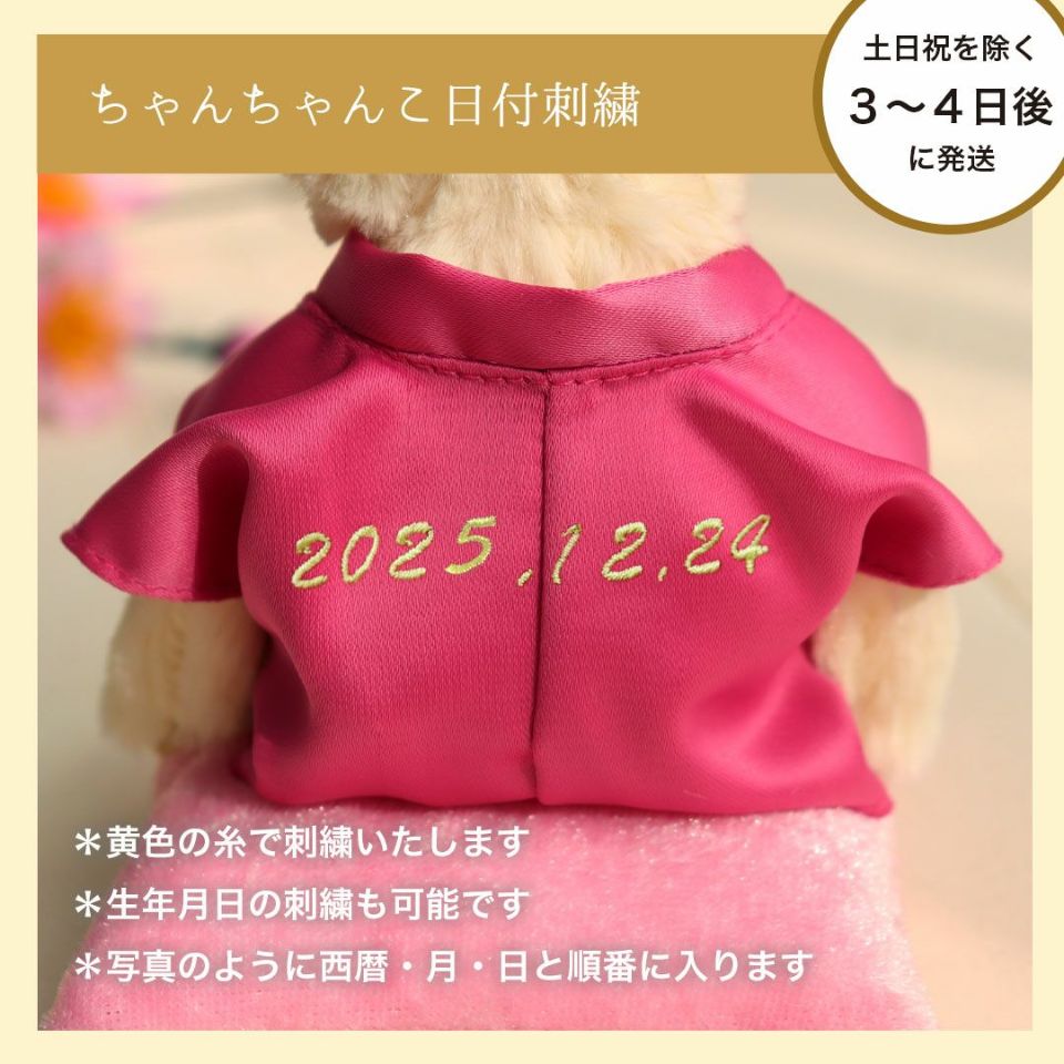 ちゃんちゃんこの背中に日付を入れる場合は、有料オプション「刺繍する」を追加のうえ、日付をご入力ください。