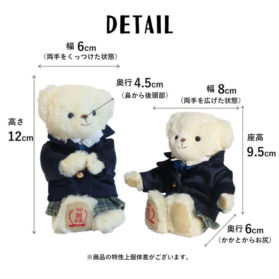 \「ありがとう」と「おめでとう」を小さなベアに込めて/ 卒業・卒園の思い出に残る、一輪ブーケ付きテディベア 制服姿のFUU(フー)と、華やかなソープフラワーの一輪ブーケがセットになった、 卒業・卒園にぴったりの記念ギフトです。 小さくても心のこもった「ありがとう」や「おめでとう」の気持ちを、そっと届けてくれます。 ■ 4種類の制服からお選びいただけます ・ブレザー/セーラー服:足裏に「2025 卒業」入り ・スモック服:足裏に「2025 卒園」入り それぞれの節目にふさわしい装いで、お祝いの気持ちを表現します。 ■ 感謝の気持ちを込めた一輪のソープフラワー カーネーションの花言葉は「愛」、 レインボーカラーのカーネーションには「感謝」という意味も。 お世話になった先生や先輩、お友達に、 「たくさんのありがとう」を花に託して贈りましょう。 ■ 手のひらサイズでも魅力たっぷり ふわふわの毛並みと可愛い表情が自慢のFUU。 ボールチェーン付きでバッグや鍵につけて持ち歩けます。 卒業後もずっと一緒に思い出を作れます♪ ■ 両手にはマグネット入り メッセージカードや写真を挟んで飾ることも可能。 冷蔵庫やロッカーなどマグネットがくっつく場所に飾って楽しめます。 ■ 年号入りで“今だけ”の特別な記念に 足裏に卒業・卒園の年度をプリント。 記憶がよみがえる、世界に一つの特別な記念品です。 ■ 無料ラッピング付き そのままプレゼントできる無料ラッピングでお届けします。 ※有料ラッピングには対応しておりません。ご了承ください。