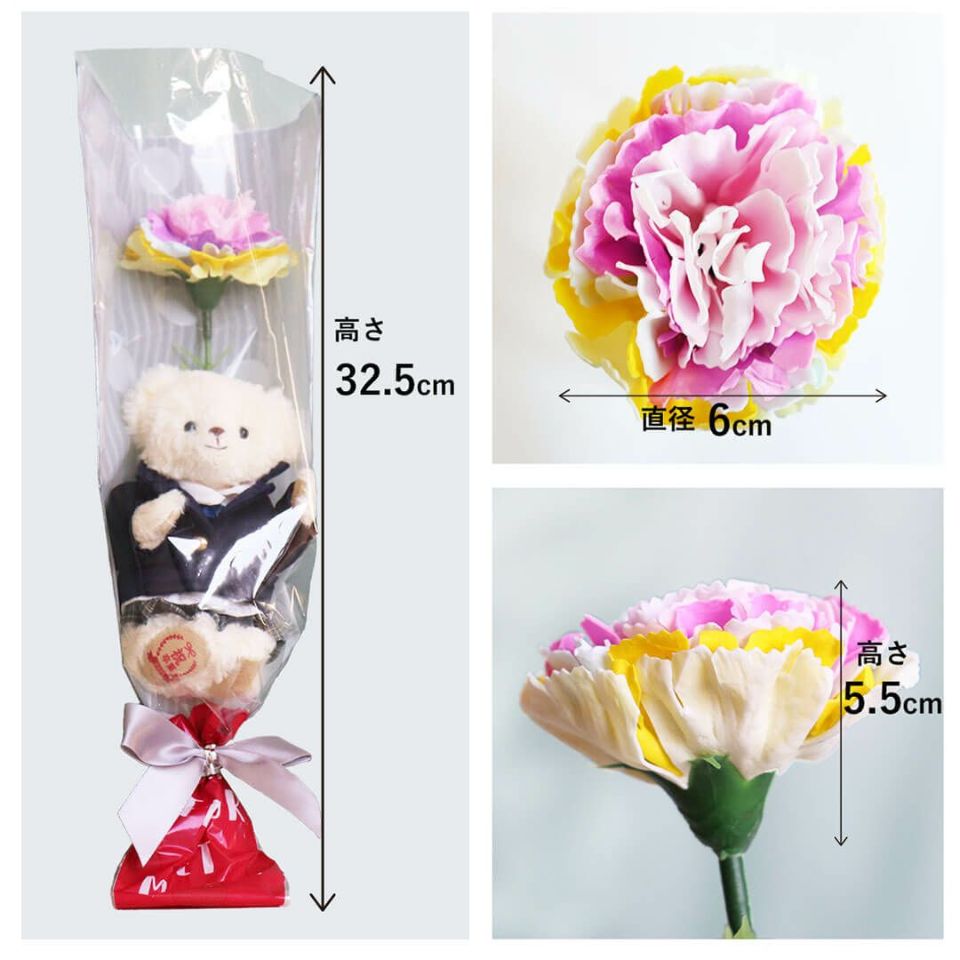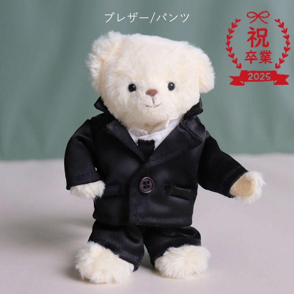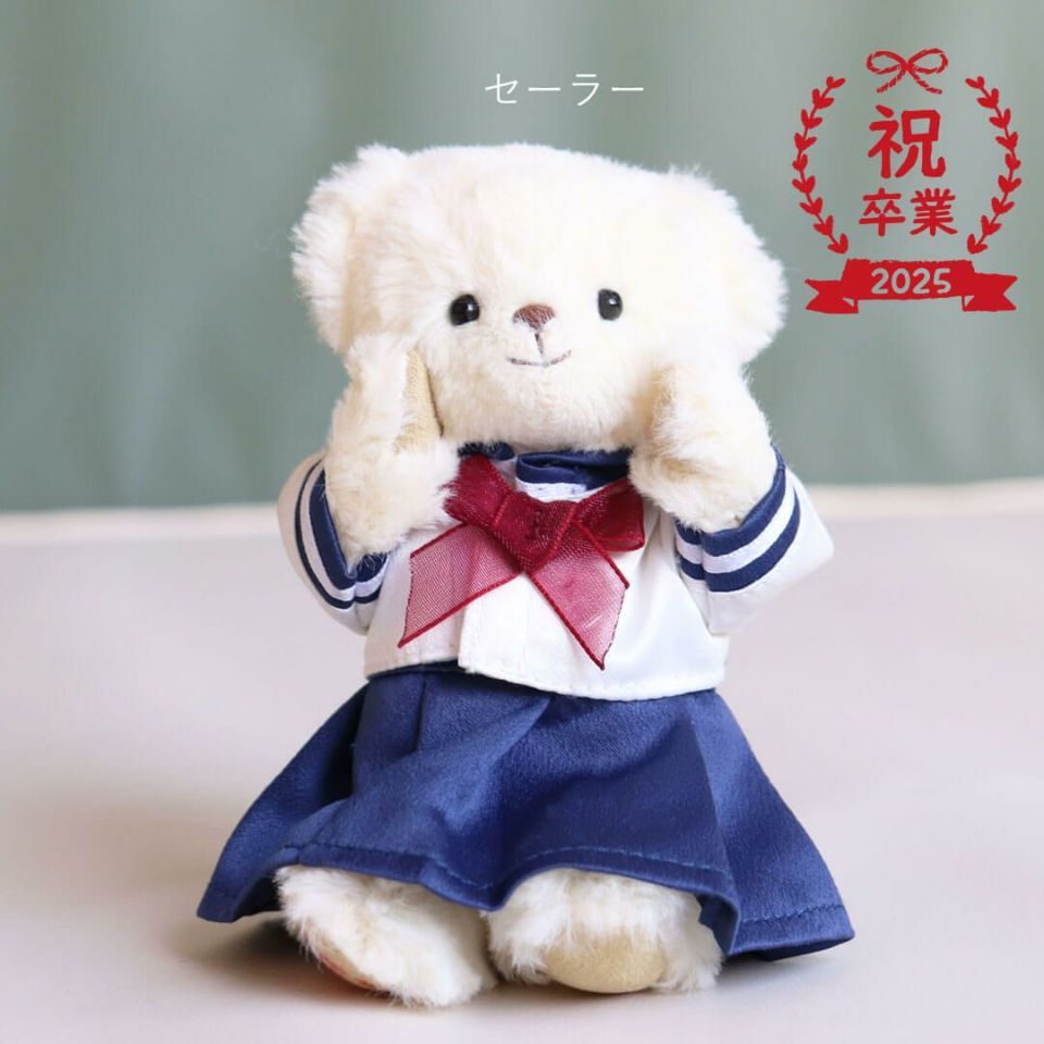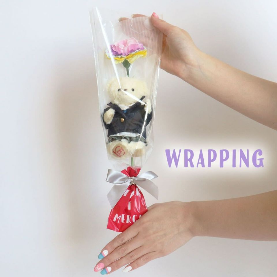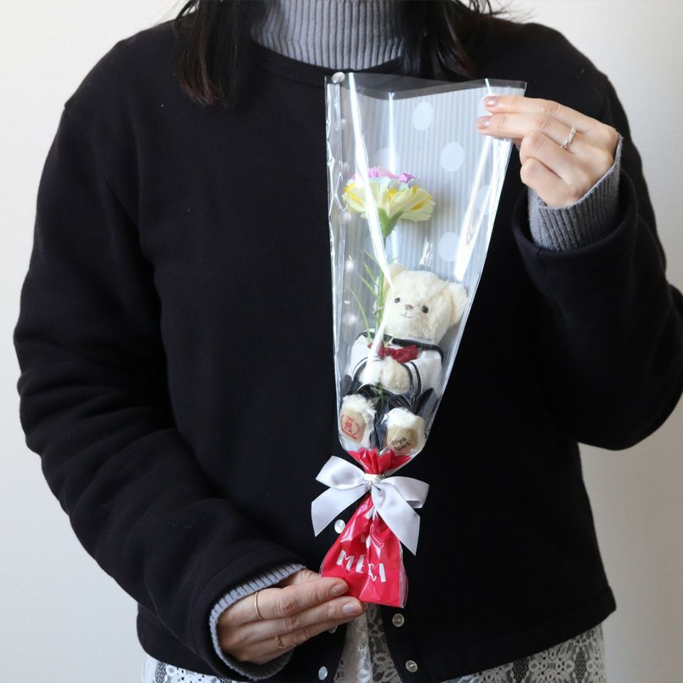 \「ありがとう」と「おめでとう」を小さなベアに込めて/ 卒業・卒園の思い出に残る、一輪ブーケ付きテディベア 制服姿のFUU(フー)と、華やかなソープフラワーの一輪ブーケがセットになった、 卒業・卒園にぴったりの記念ギフトです。 小さくても心のこもった「ありがとう」や「おめでとう」の気持ちを、そっと届けてくれます。 ■ 4種類の制服からお選びいただけます ・ブレザー/セーラー服:足裏に「2025 卒業」入り ・スモック服:足裏に「2025 卒園」入り それぞれの節目にふさわしい装いで、お祝いの気持ちを表現します。 ■ 感謝の気持ちを込めた一輪のソープフラワー カーネーションの花言葉は「愛」、 レインボーカラーのカーネーションには「感謝」という意味も。 お世話になった先生や先輩、お友達に、 「たくさんのありがとう」を花に託して贈りましょう。 ■ 手のひらサイズでも魅力たっぷり ふわふわの毛並みと可愛い表情が自慢のFUU。 ボールチェーン付きでバッグや鍵につけて持ち歩けます。 卒業後もずっと一緒に思い出を作れます♪ ■ 両手にはマグネット入り メッセージカードや写真を挟んで飾ることも可能。 冷蔵庫やロッカーなどマグネットがくっつく場所に飾って楽しめます。 ■ 年号入りで“今だけ”の特別な記念に 足裏に卒業・卒園の年度をプリント。 記憶がよみがえる、世界に一つの特別な記念品です。 ■ 無料ラッピング付き そのままプレゼントできる無料ラッピングでお届けします。 ※有料ラッピングには対応しておりません。ご了承ください。