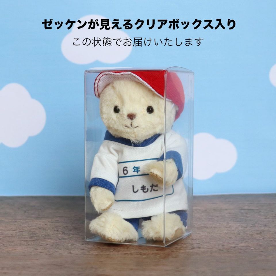 小学校最後の運動会に、エールを込めて。 組体操・リレー・応援合戦…がんばる君に贈りたい “ミニ体操服ベア”は、ゼッケンにお名前が入る特別仕様! 運動が得意な子も、苦手な子も。 リレーに燃える子も、体育がちょっと苦手な子も。 そんなみんなの努力や勇気を、やさしく見守る「応援ベア」です。 ●ゼッケンには年・組・名前が入れられます! 体操服の胸に、まるで本物のようなゼッケン付き。 年(数字)・組(数字)・名前を印刷できます。 名字は漢字・ひらがな・カタカナで5文字まで、アルファベットは8文字までOK!(※空白含む) ●親子で共有できる“思い出”のカタチ ドロドロになった体操服を何度も洗った日々。 応援席から見つけたあの勇姿。 体操服には、親子で刻んだ思い出が詰まっています。 その体操服を、ぬいぐるみサイズで忠実に再現しました。 卒業後も思い出が色褪せないよう、ひとつひとつ丁寧に手作業でプリントいたします。 ●両手がくっつく!応援ポーズにも 手にマグネット入りなので、両手を合わせてお祈りポーズや、仲良く手をつないで飾ることもできます。 友達同士で持ってもかわいい卒業記念品に。 ●見せて飾れる、透明クリアBOX入り ゼッケンがしっかり見えるよう、中身が見える透明ギフトボックスに入れてお届けします。 卒業式・最後の運動会・謝恩会の贈り物にもおすすめです。 【ここがポイント!】 ・ゼッケンに年・組・名前入り! ・名前入りで特別感たっぷり! ・1体ずつ丁寧に手作業プリント ・お届けまで約1週間(入金確認後) ・応援ポーズや手つなぎもできるマグネット入り両手 ・ゼッケンが見えるギフトボックス入り