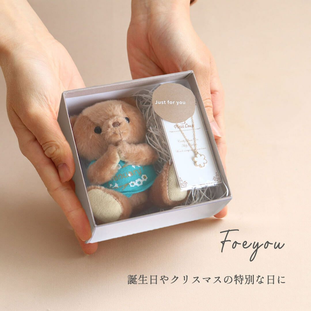 誕生日プレゼントにぴったりの名入れテディベアギフト。右足裏に366日から選べる誕生日をプリント。 ふわふわの毛並みが魅力の12cmベア「FUU」は、人気No.1。持ち運びに便利なボールチェーン付きで、お出かけにも◎ ハートネックレスとギフトBOX付きで、女性への誕生日や記念日の贈り物におすすめです。