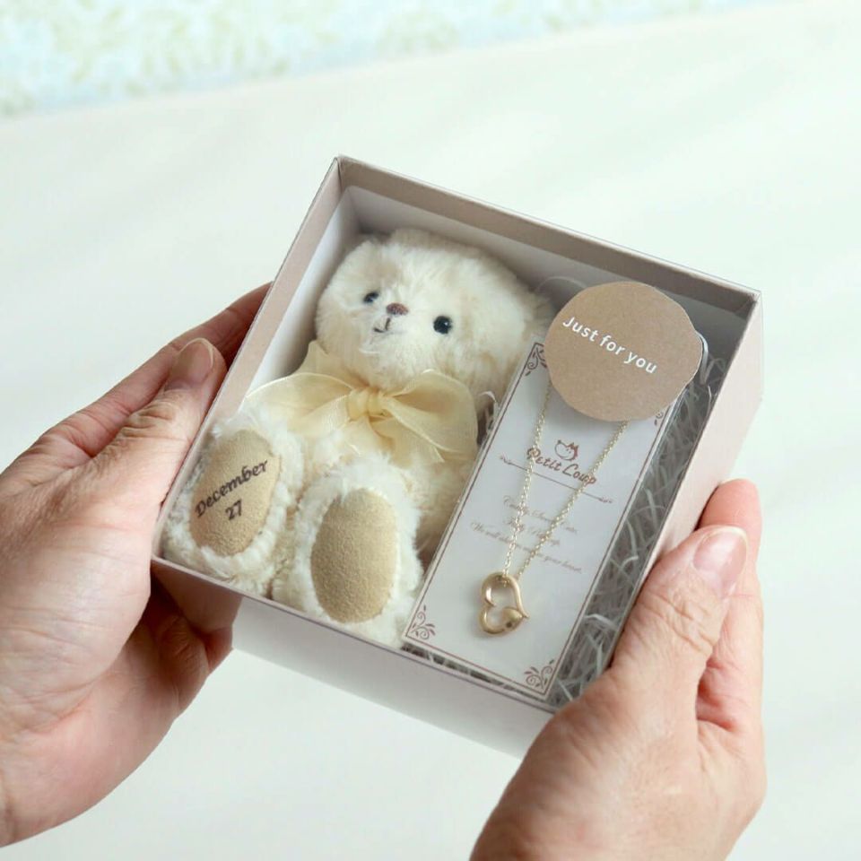 【誕生日366日対応】バースデーテディベアFUU|記念日をカタチに残す特別なギフト プティルウは、人と人を結ぶぬいぐるみをつくり続けて半世紀以上。 ふわふわの毛並みとやさしい表情が人気の「FUU(フー)ベア」は、誕生日366日すべてに対応した特別なバースデーテディベアです。右足裏に誕生月(英語表記)と日付をプリントし、大切な思い出をカタチに残します。 手のひらサイズの12cmベアは、ライトイエローカラーと上品なくすみカラーのオーガンジーリボンで優しくナチュラルな印象。ボールチェーン付きでバッグチャームやキーホルダーとして一緒にお出かけも◎。 両手にマグネットが入っており、カードを持たせたりポーズをとらせたり、楽しみ方もいろいろ。 ハートモチーフネックレス さらに「女性の定番」ハートモチーフのネックレス付き。薄めのゴールドカラーはどんな装いにも合わせやすく、プレゼントにもぴったりです。 お届けは「Just for you」シール付きのスリーブ式ギフトボックスで、そのまま渡せるのも嬉しいポイント。 FUUベアは着せ替えも楽しめるため、コレクションや推し活にも人気のアイテムです。 誕生日ギフト・記念日プレゼント・推しの誕生日に。あなただけの「特別な1日」を可愛く残しませんか?