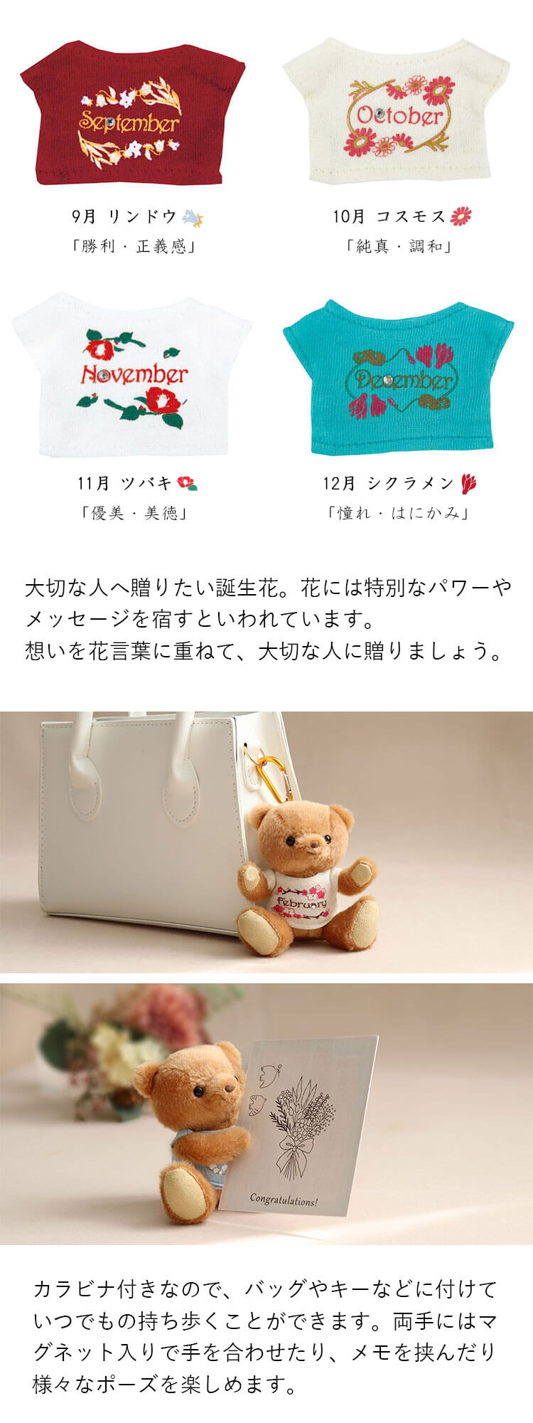 セット内容 ベア1体(誕生花Tシャツ着用)、フラワーネックレス1本、ギフトボックス、説明リーフレット