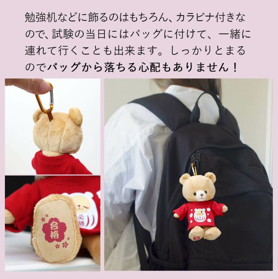 今年就活頑張りたくてテディベアの合格祈願を購入しました!持ってるだけでも緊張がほぐれます!私はテディベアが好きなのでバックに付けて就活頑張ってます!就活してる人にもオススメだと思います!
