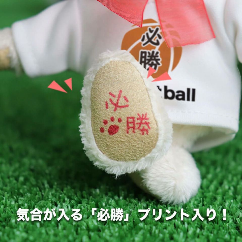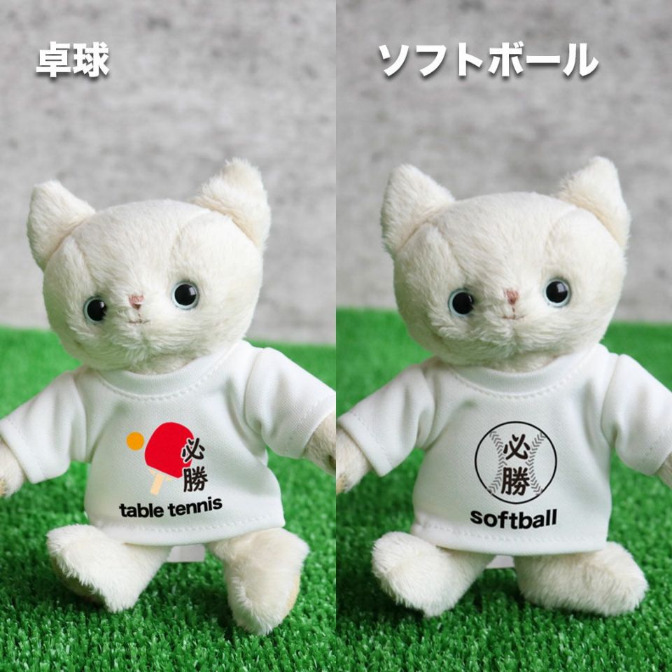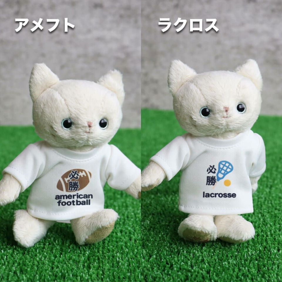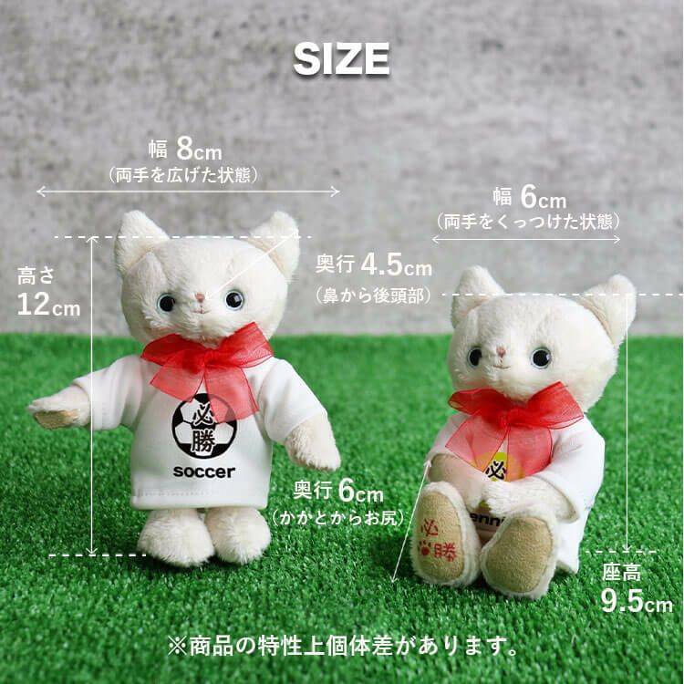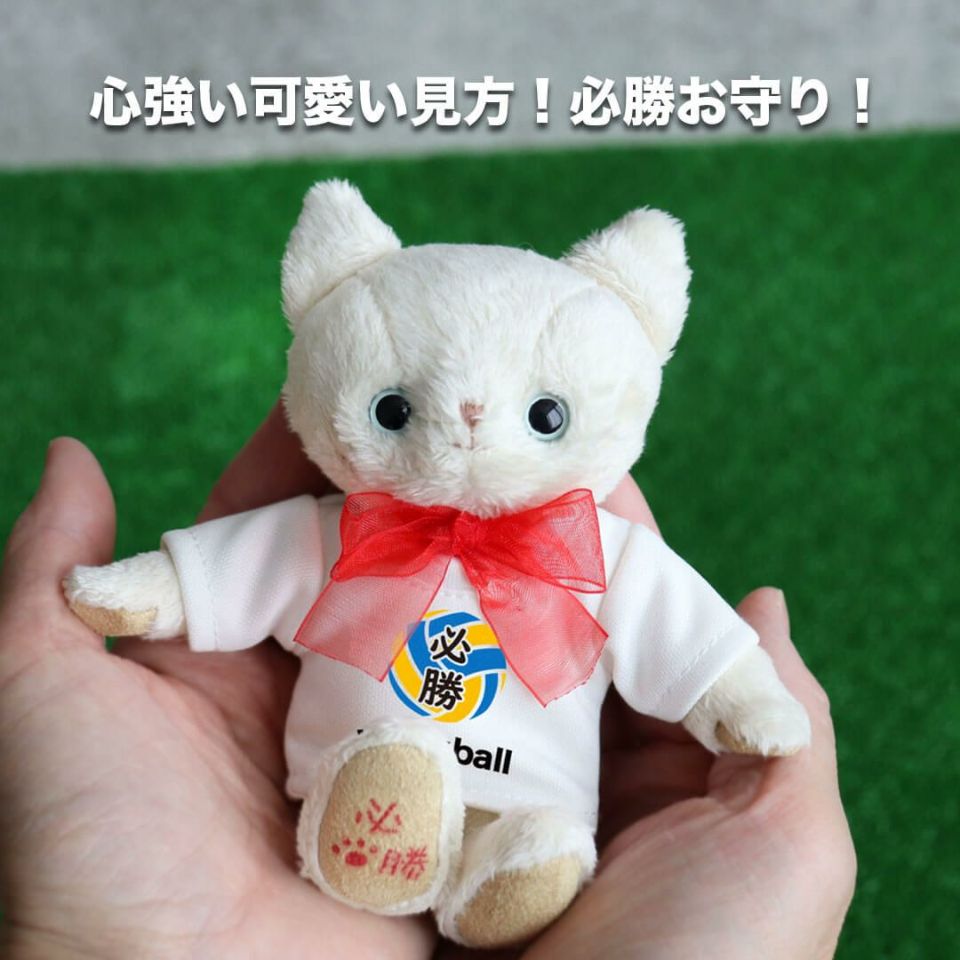 必勝祈願のお守りに!クラブ・部活応援グッズ「必勝ネコマスコット」 がんばれの気持ちをカタチに! クラブチームや部活動、応援したい選手に贈る、必勝祈願のお守りマスコットです。 大きな目が印象的な白ネコが、チームの絆をぎゅっと結びます。 背中のTシャツには「お名前」と「背番号」をプリントでき、世界にひとつだけの応援グッズとしてお届けします。 ●「必勝」の気持ちを込めて Tシャツにはスポーツアイコン&「必勝」の文字を力強くデザイン。 右足裏にも「必勝」の手描き風フォントとかわいい肉球をプリントしています。 ※足裏プリントの変更はできません。 ●1個からオーダーOK! 名前と背番号を背中側にプリントいたします。 チームでまとめてご注文いただくことも、個人でのオーダーも可能です。 プリントは職人が丁寧に手作業で仕上げるため、ご入金確認後、土日祝を除き最短2~4日後の発送となります。 ●幸運を招く「ネコ」モチーフ ネコは古来より、魔よけや幸運の象徴とされ、招き猫など縁起物として親しまれてきました。 チームの勝利と安全を祈るお守りにぴったりの存在です。 ●持ち歩けるボールチェーン付き バッグやリュックに付けて、いつも一緒に応援できます。 ●地元神社で祈願済み この必勝お守りは、心願成就のご祈祷をいただいています。 紀貫之や清少納言の記録にも登場する、由緒ある神社のご利益とともに、皆様の努力が実を結ぶことを願っています。