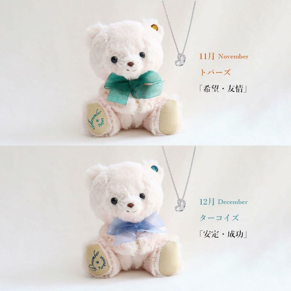 プレゼントにぴったりなネックレスとベアのギフトセット 「彼女や奥さんに」 人気のハートモチーフのネックレス!いつも身に着けられるアクセサリーは女性がもらって嬉しいプレゼントです。 「お子様やお孫さんに」 ぬいぐるみとネックレスのセットは年頃の女の子が喜ぶアイテム! 「お子さんの1歳の誕生日はママも1歳の誕生日」 無1歳を迎えたお子様への誕生日とともに、大変な時期を乗り越えたママにも1歳おめでとうのお祝いを。目に入るたびに「この子が産まれたときに贈られたもの」という思い出がよみがえり、特別なギフトになること間違いなしです。 ●teteベアってどんなベア? ふわふわの体と、耳に誕生石カラーをつけたteteベアは、いつも傍にいてあなたを守護し、和ませてくれるおまもりのようなマスコットです。 ●誕生石カラーで選べる12ヶ月のベア ベアの耳にきらめく誕生石カラーのクリスタルは12ヶ月それぞれに守護石カラーとしての特別なパワーを持っています。さらに足裏には誕生月と誕生石名をプリントした、スペシャルな誕生日ギフトです。 リボンと足裏プリントのカラーは誕生石カラーとリンクした全4色。小さな10cmサイズの中に、たくさんのこだわりを詰め込みました。 また、お名前を入れることも可能。(別途有料オプション) 大切な人に誕生日に贈る特別なプレゼントとしてオススメです。