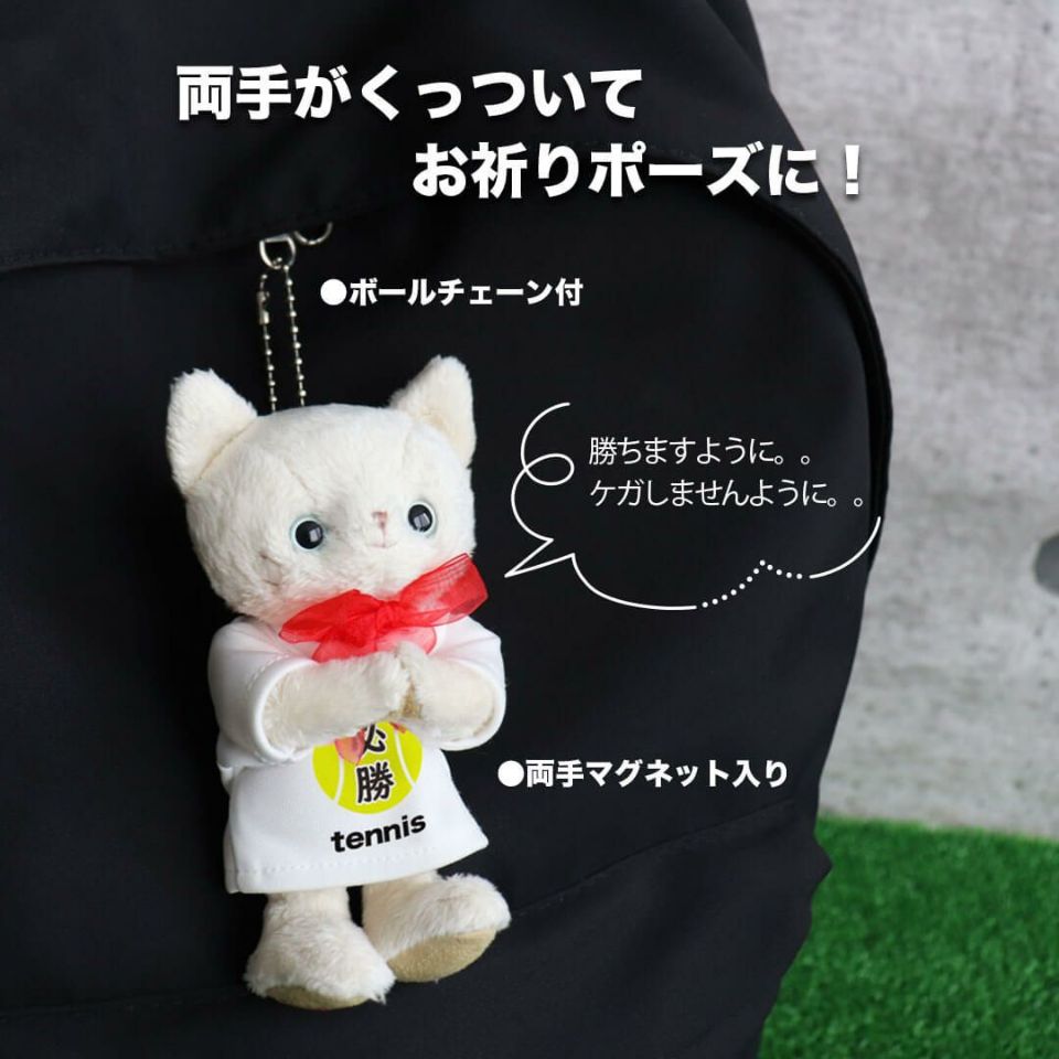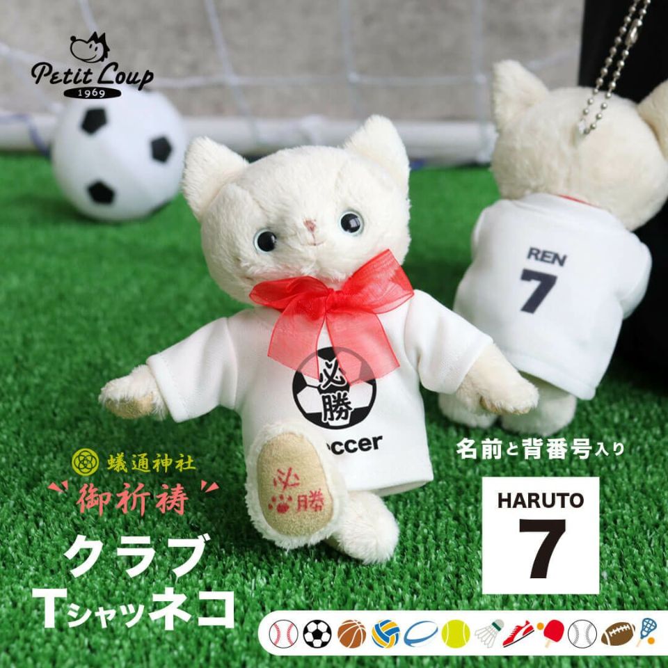 必勝祈願のお守りに!クラブ・部活応援グッズ「必勝ネコマスコット」 がんばれの気持ちをカタチに! クラブチームや部活動、応援したい選手に贈る、必勝祈願のお守りマスコットです。 大きな目が印象的な白ネコが、チームの絆をぎゅっと結びます。 背中のTシャツには「お名前」と「背番号」をプリントでき、世界にひとつだけの応援グッズとしてお届けします。 ●「必勝」の気持ちを込めて Tシャツにはスポーツアイコン&「必勝」の文字を力強くデザイン。 右足裏にも「必勝」の手描き風フォントとかわいい肉球をプリントしています。 ※足裏プリントの変更はできません。 ●1個からオーダーOK! 名前と背番号を背中側にプリントいたします。 チームでまとめてご注文いただくことも、個人でのオーダーも可能です。 プリントは職人が丁寧に手作業で仕上げるため、ご入金確認後、土日祝を除き最短2~4日後の発送となります。 ●幸運を招く「ネコ」モチーフ ネコは古来より、魔よけや幸運の象徴とされ、招き猫など縁起物として親しまれてきました。 チームの勝利と安全を祈るお守りにぴったりの存在です。 ●持ち歩けるボールチェーン付き バッグやリュックに付けて、いつも一緒に応援できます。 ●地元神社で祈願済み この必勝お守りは、心願成就のご祈祷をいただいています。 紀貫之や清少納言の記録にも登場する、由緒ある神社のご利益とともに、皆様の努力が実を結ぶことを願っています。