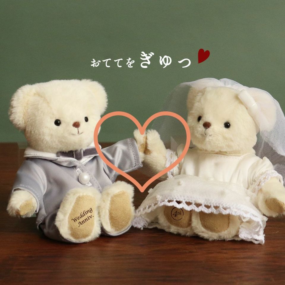 結婚の日を思い出す、タキシード&ウェディング姿のカップルベア。お二人が紡いできた結婚周年数をベアに込めて、お祝いの気持ちと共に贈りましょう。 25年・50年といった節目の記念日はもちろん、節目の記念日まではまだ少し遠くても一緒に歩んできた年数は何物にも代えがたい宝物。 奥さまへ感謝の気持ちをこめたプレゼントとして、ご夫婦で記念品として、子供や孫・友人といった周りの人達からのお祝いとしても素敵です。 長い年月を共に過ごして来たお二人に、尊敬と祝福の気持ちを込めて「おめでとう」。 そして両親が出会って結婚してくれたことに「ありがとう」。これからのお二人の人生がさらに素敵なものとなりますように。 ●結婚周年数をご入力ください 例:5周年 1周年のお祝いなら「1st」 2周年のお祝いなら「2nd」 3周年のお祝いなら「3rd」 4周年~のお祝いなら「4th、5th・・・」と およめさんベアの右足裏にプリント致します。 おむこさんベアの右足裏には「Wedding Anniv.」とプリント致します。