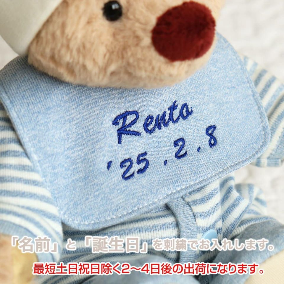 赤ちゃんの「はじめてのおともだち」お名前と誕生日入りのファーストベア 欧米では、赤ちゃんが生まれた時に贈る「ファーストベア(First Bear)」という習慣があります。 このぬいぐるみは、赤ちゃんの最初のおともだちとして、生涯にわたって大切にされる存在。 そんな素敵な習慣を、日本でも贈り物にしてみませんか? ●お名前&お誕生日を刺繍した、世界にひとつのスタイ テディベアが身につけているスタイには、お子さまのお名前とお誕生日を刺繍いたします。 ご家族が増えた記念に、心のこもった贈り物としてぴったりです。 見るたびに、あの日の感動がよみがえります。 ●こだわりのベビーロンパースセット テディベアは、新生児のような本格ロンパースセットを着用。 ・やさしい形のベビーキャップ ・小さなベビーシューズ ・丁寧に縫製されたロンパース ・お名前&誕生日入りのオリジナルスタイ 全て脱着可能で、お子様と一緒に着せ替え遊びも楽しめます。 ●表情が変わる!ふれあいベア 両手にはマグネット、ほっぺたにはメタルプレートが入っているので、 手を合わせたり、ほっぺに手を添えたり、表情豊かに遊べます。 兄弟ベアを並べて手をつなげば、もっと可愛い記念写真も撮れます♪ 出産祝い・誕生記念・ハーフバースデーにもおすすめ 初めてのぬいぐるみは、お子さまにとって特別な存在になるはず。 成長とともに思い出を刻んでいける、世界にひとつだけのファーストベアを贈ってみませんか?