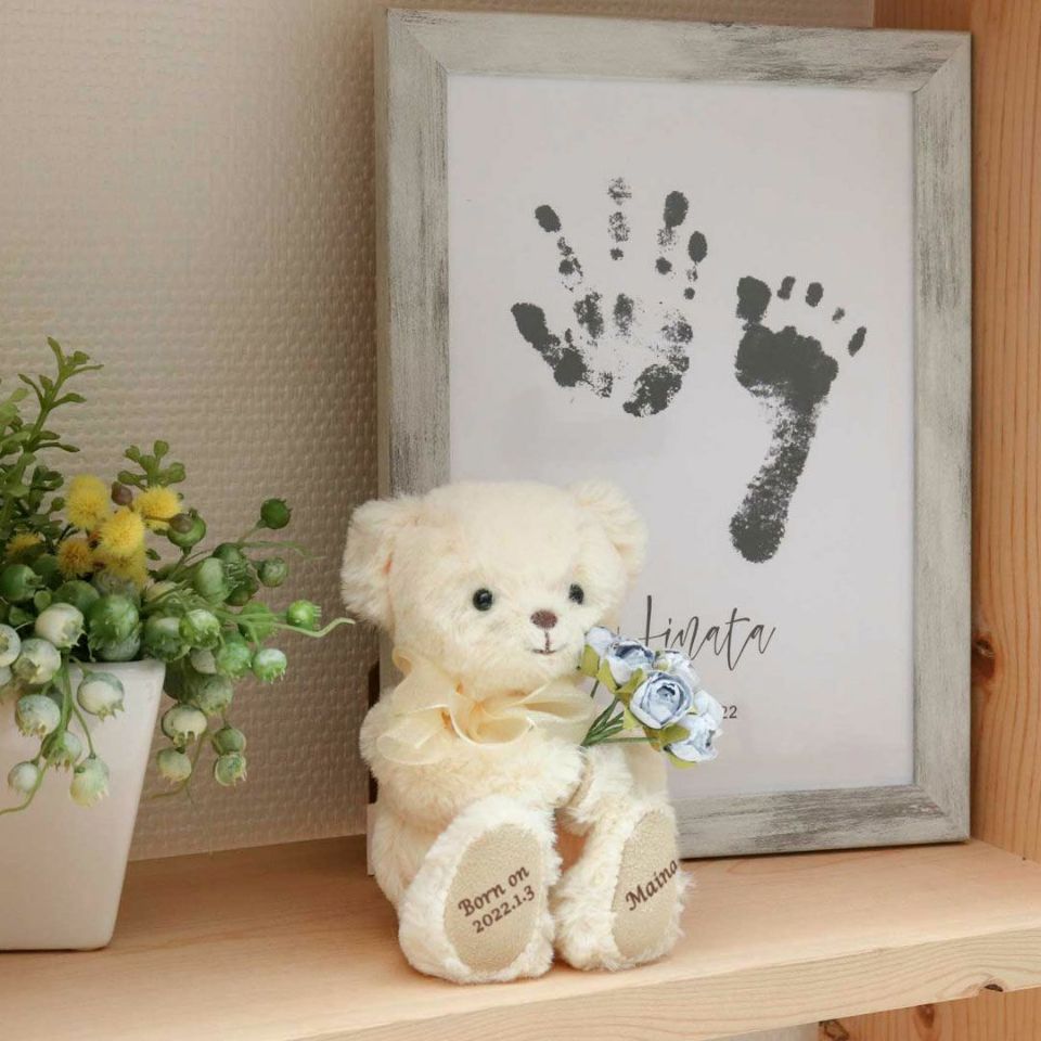 足裏に誕生した日付と赤ちゃんのお名前をプリントした、世界で一つだけの特別なテディベア。かわいい手のひらサイズだから、置く場所を選ばず飾っていただけ、目にするたびに生まれた時の喜びを思い出させてくれます。