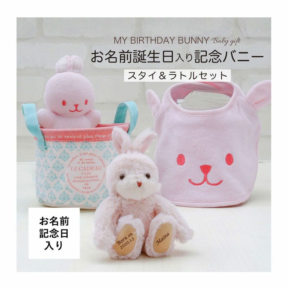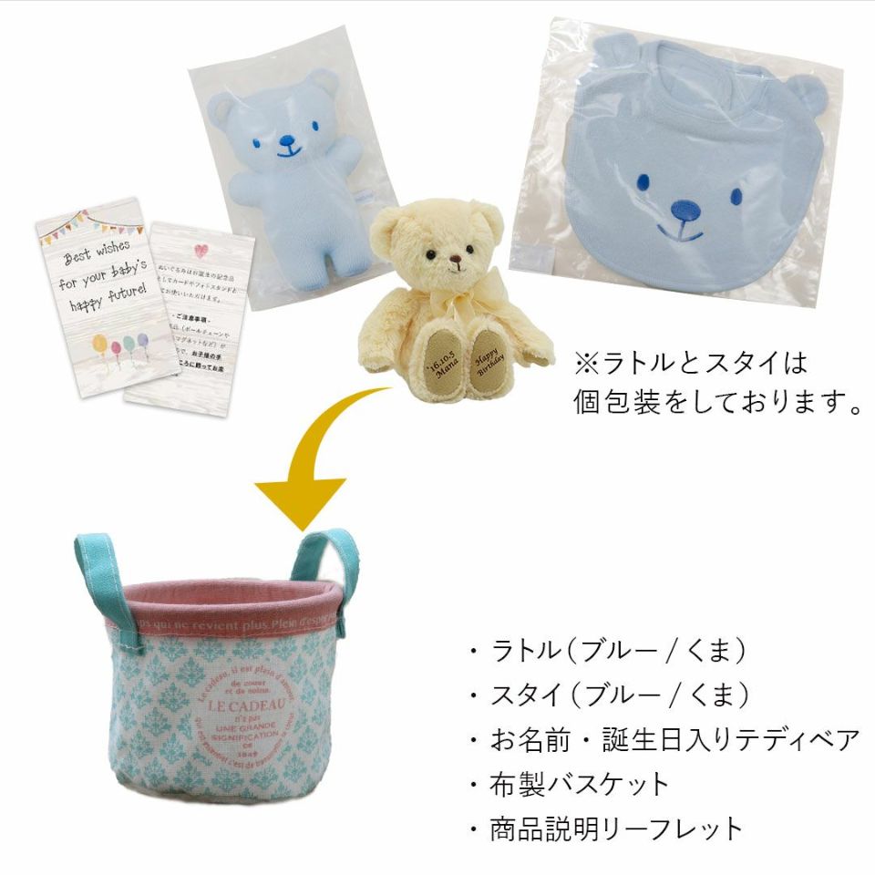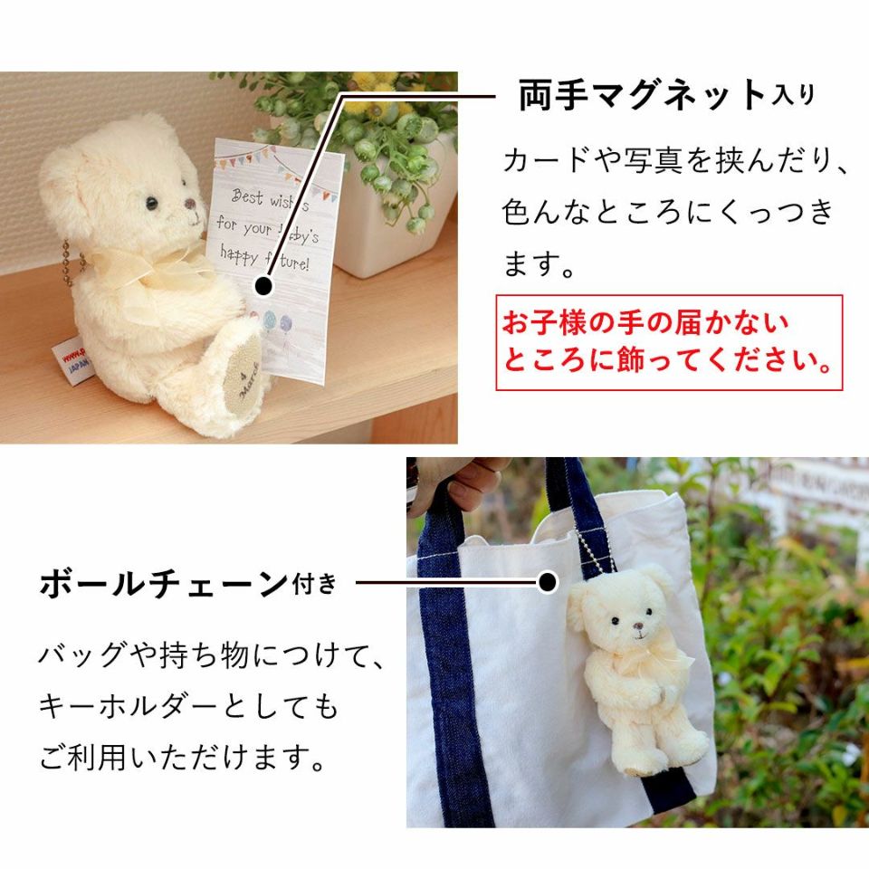 お誕生のよろこびを 小さなテディベアに込めて贈ろう テディベアの足裏に、誕生した日と赤ちゃんのお名前をプリントした、世界に一つだけの特別な記念品です。 かわいい手のひらサイズちょこんと飾ったり、ボールチェーンで持ち物につけたり。置く場所を選ばず飾っていただけ、目にするたびに生まれたときの喜びを思い出させてくれます。 かわいいクマさんのスタイとベビーラトル付き 元気なクマさんをイメージしたデザインのスタイとラトル(ガラガラ)。ラトルは降ると音が鳴るかわいくて楽しいベビーグッズ。ホルマリン検査済みの柔らかなタオル素材なので、パパママも安心の赤ちゃんのお友達です。スタイとベビーラトルは通常の洗濯洗剤でお洗濯できます。(ベアは洗濯できません)