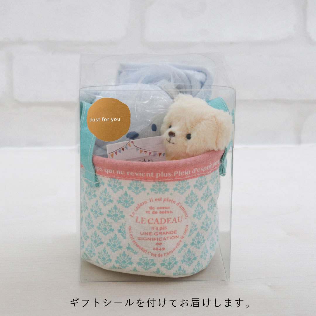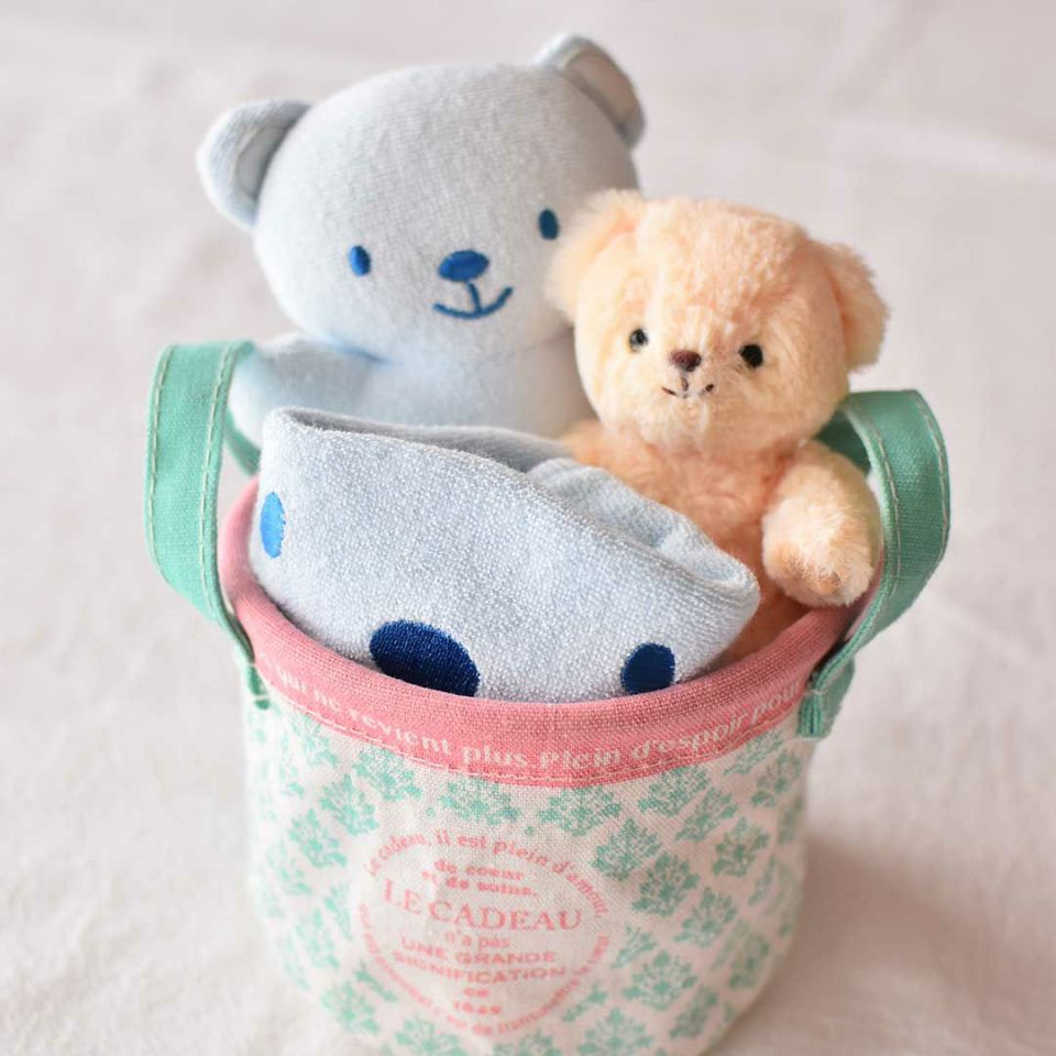 いくつ合っても嬉しい、スタイとラトル、小物入れとセットになったベビーギフトです。