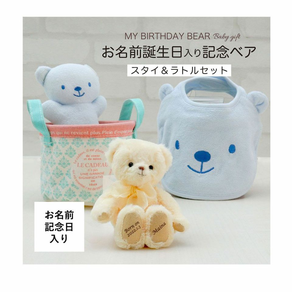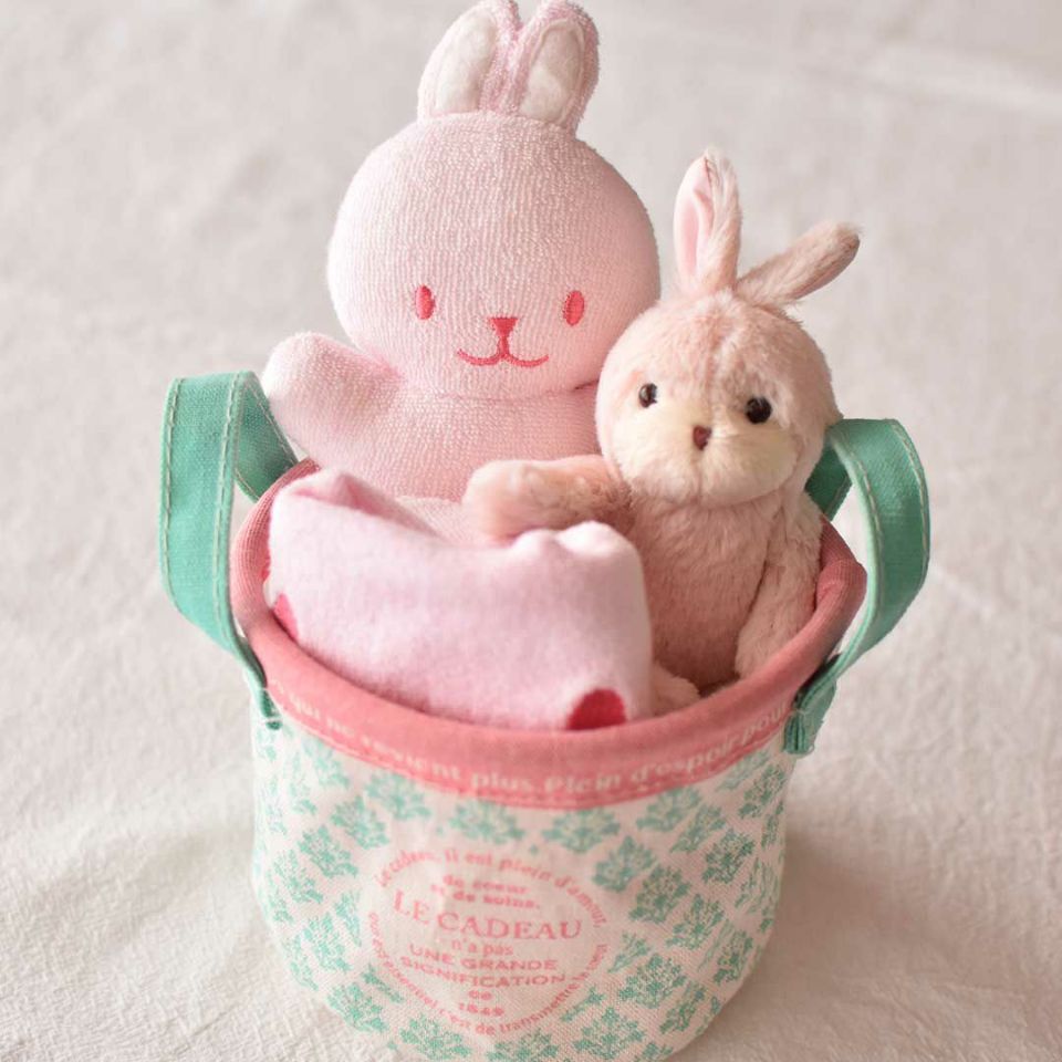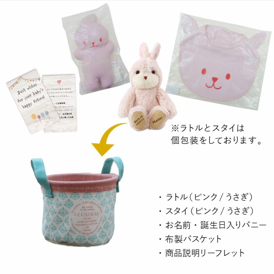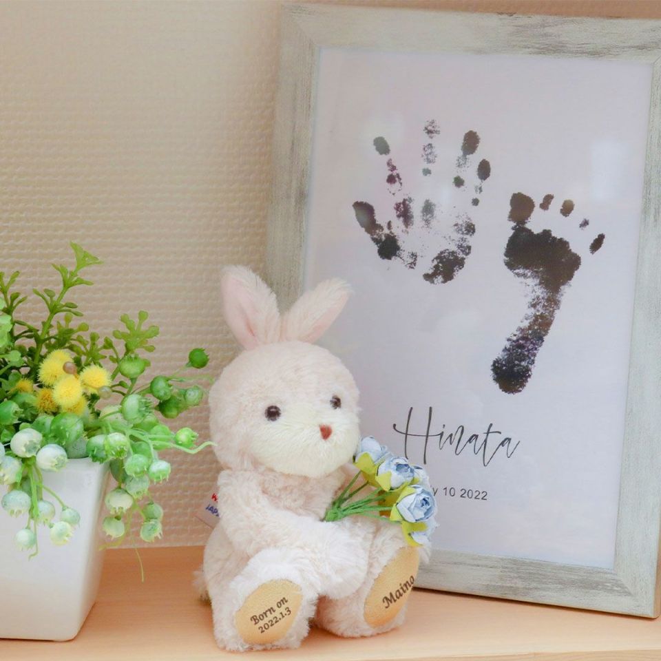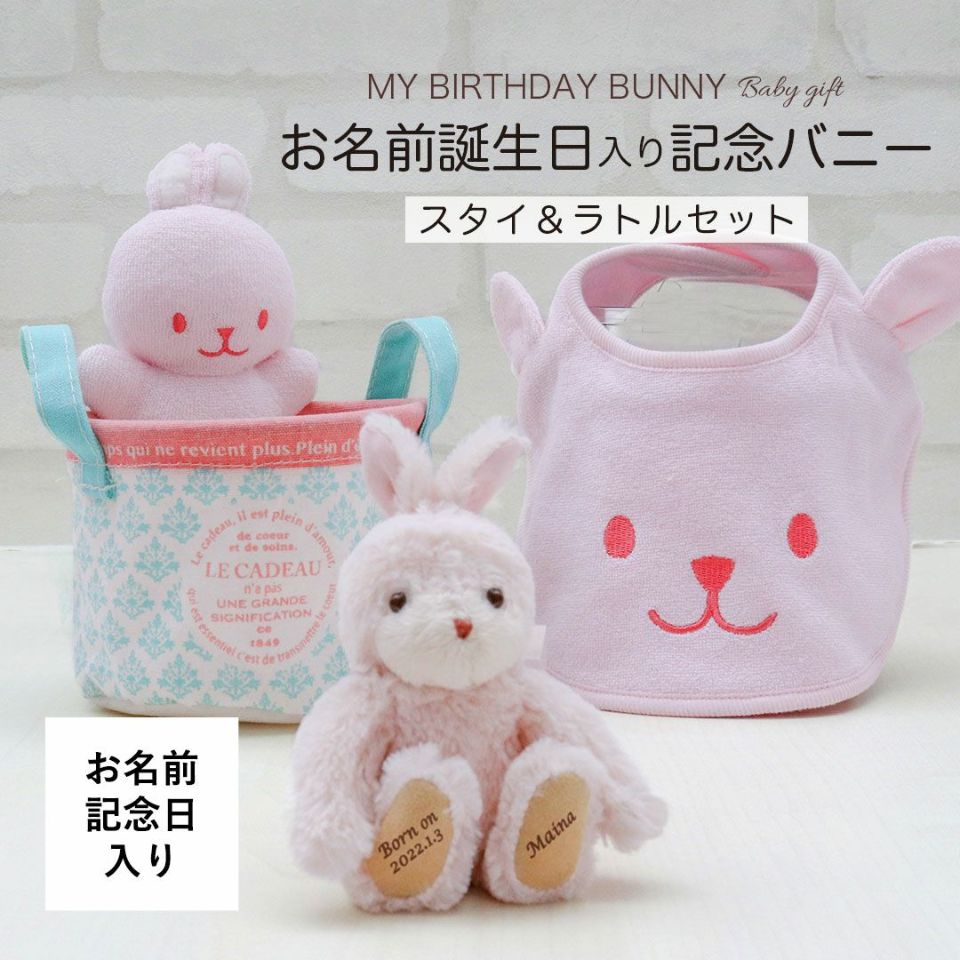 お誕生のよろこびを 小さなバニーに込めて贈ろう ミニバニーの足裏に、誕生した日と赤ちゃんのお名前をプリントした、世界に一つだけの特別な記念品です。 かわいい手のひらサイズちょこんと飾ったり、ボールチェーンで持ち物につけたり。置く場所を選ばず飾っていただけ、目にするたびに生まれたときの喜びを思い出させてくれます。 かわいいウサギさんのスタイとベビーラトル付き やさいいウサギさんをイメージしたデザインのスタイとラトル(ガラガラ)。ラトルは降ると音が鳴るかわいくて楽しいベビーグッズ。ホルマリン検査済みの柔らかなタオル素材なので、パパママも安心の赤ちゃんのお友達です。スタイとベビーラトルは通常の洗濯洗剤でお洗濯できます。(ミニバニーは洗濯できません)
