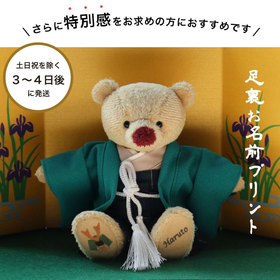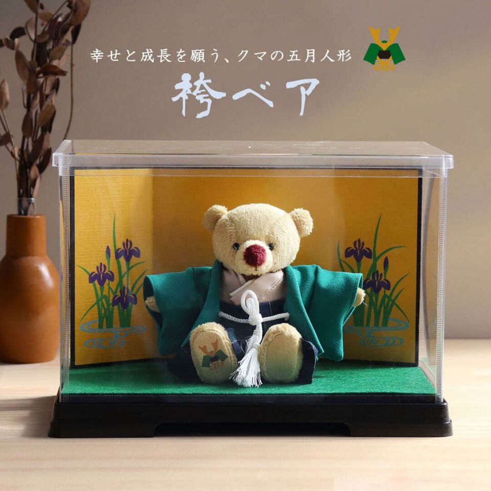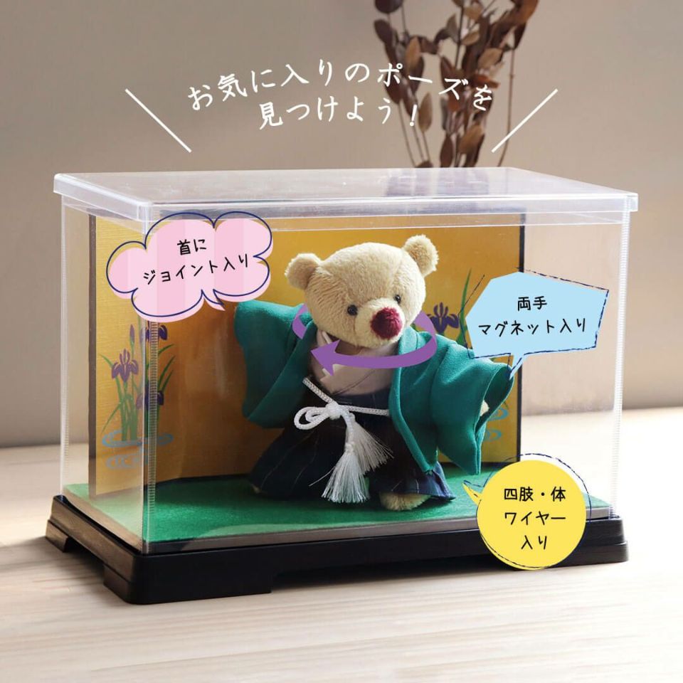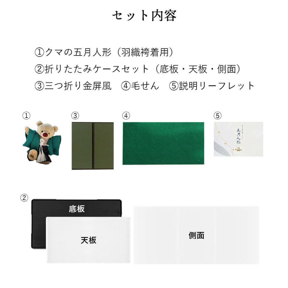 セット内容 クマの五月人形(羽織袴着用)・折りたたみケースセット(底板/天板/側面)・三つ折り金屏風・毛せん・説明リーフレット