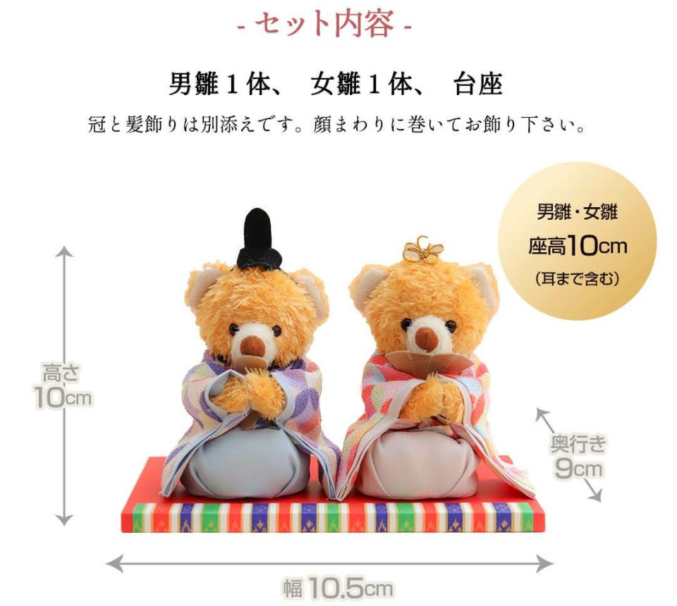 【お雛様セット】座高:約10cm(飾った状態/頭飾り含まず) 【台座】10.5cm×18cm×0.9cm※商品の特性上個体差がございます。