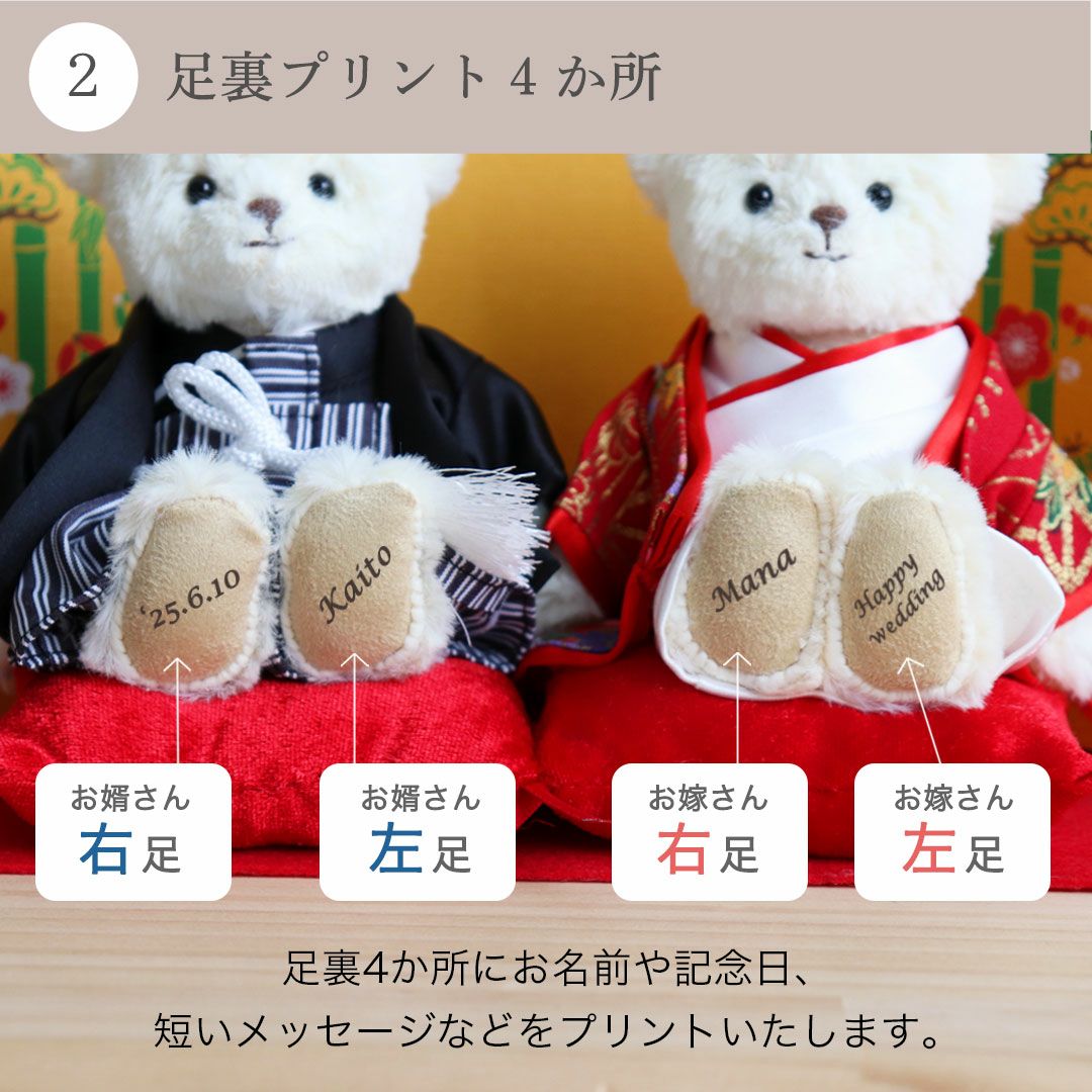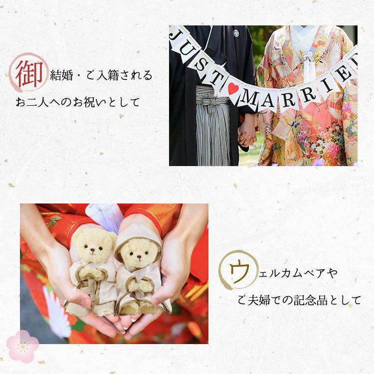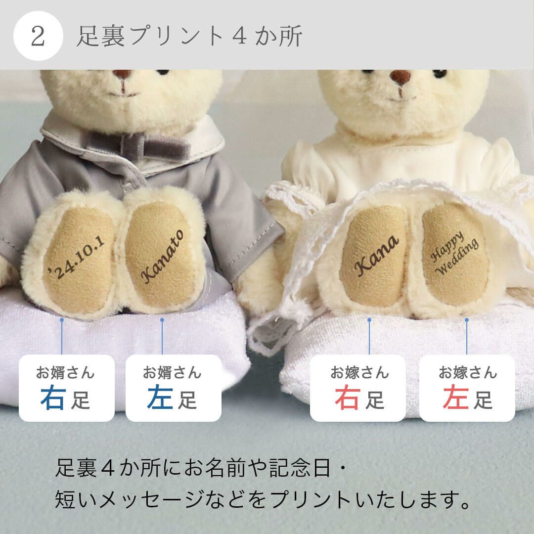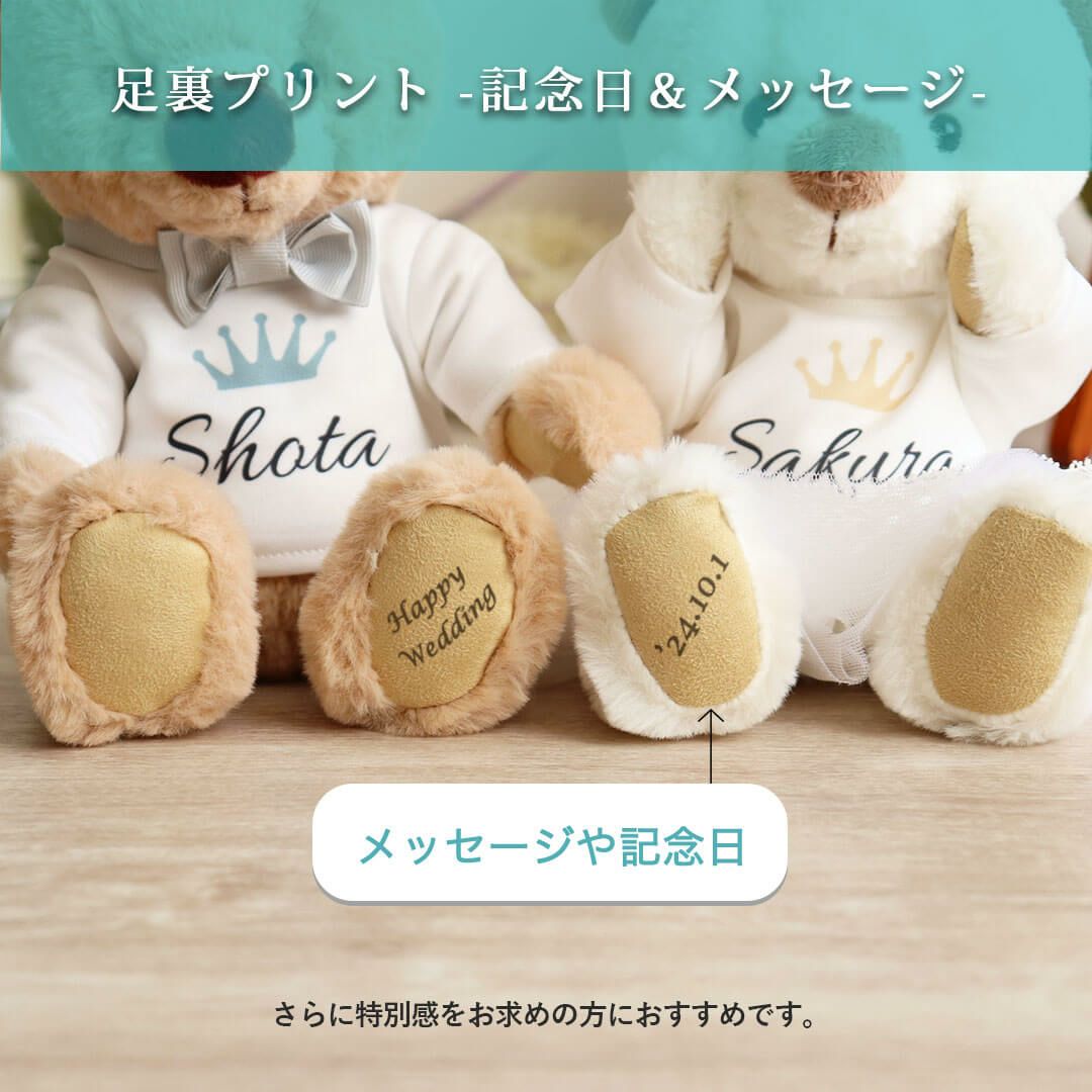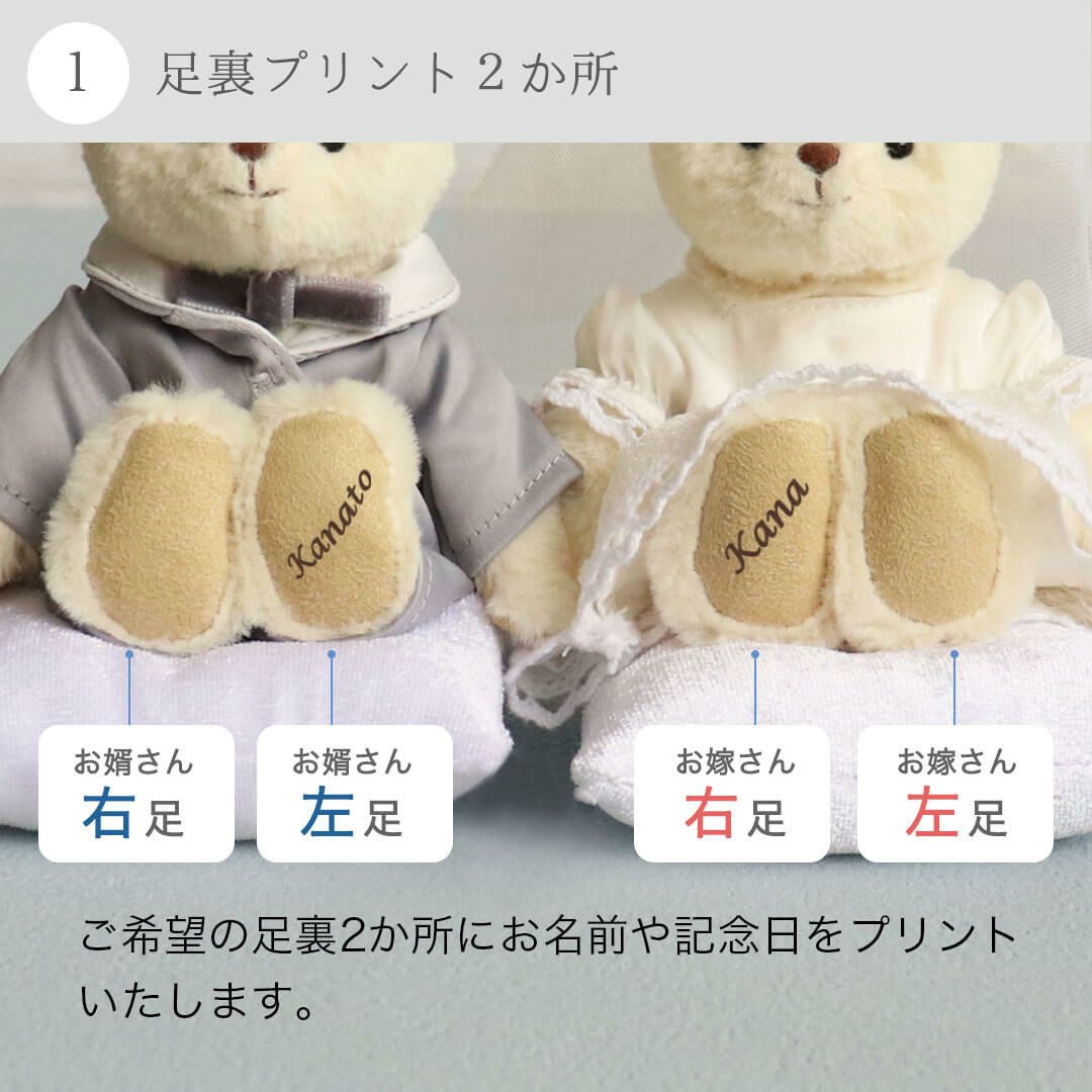 ゲストをお迎えするウェルカムベアや、ご結婚・ご入籍の記念ギフトとしておすすめです。ドレス・和装・カジュアルなど、さまざまなスタイルのベアがございます。足裏にはおふたりのお名前や記念日を入れることも。