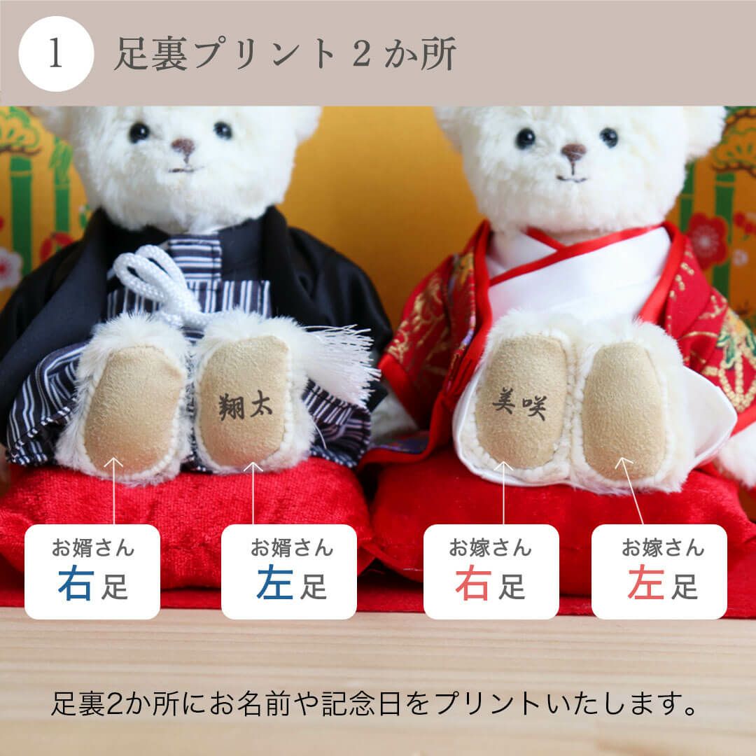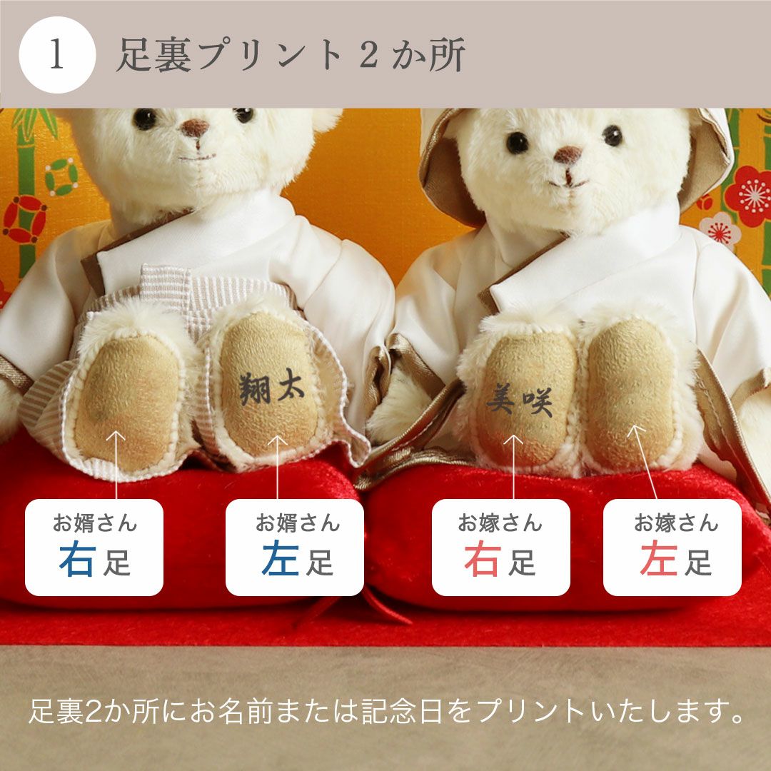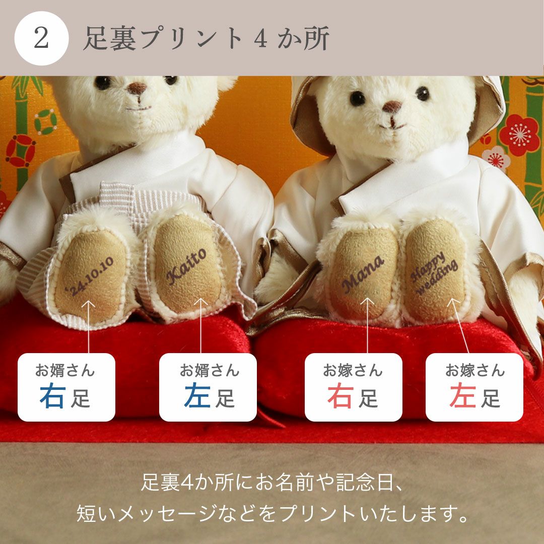 ゲストをお迎えするウェルカムベアや、ご結婚・ご入籍の記念ギフトとしておすすめです。ドレス・和装・カジュアルなど、さまざまなスタイルのベアがございます。足裏にはおふたりのお名前や記念日を入れることも。