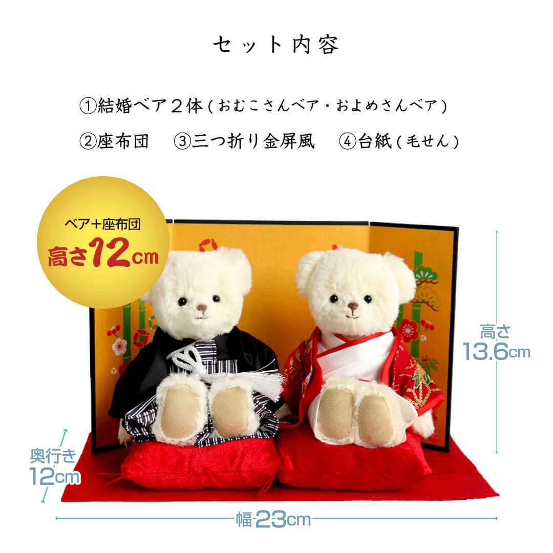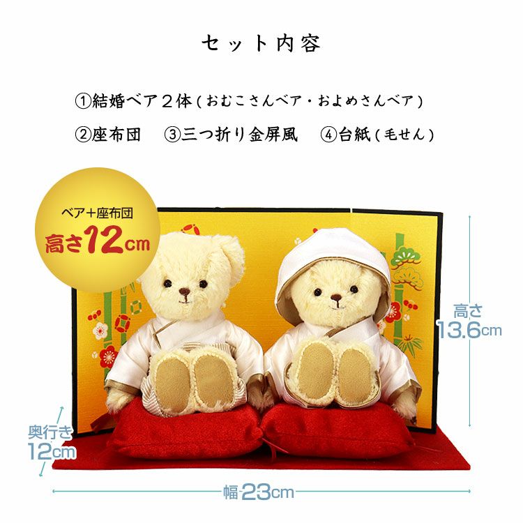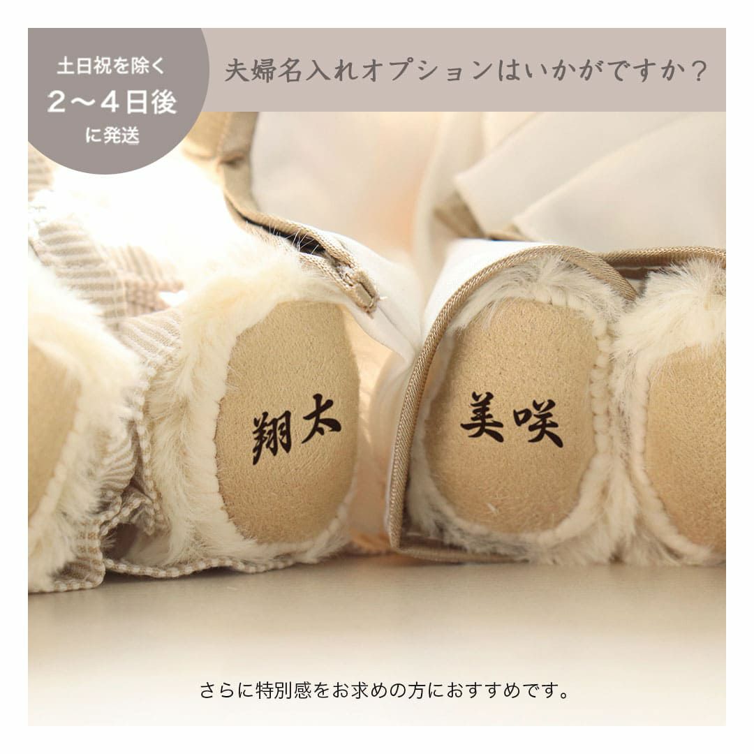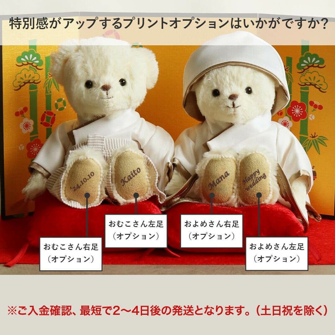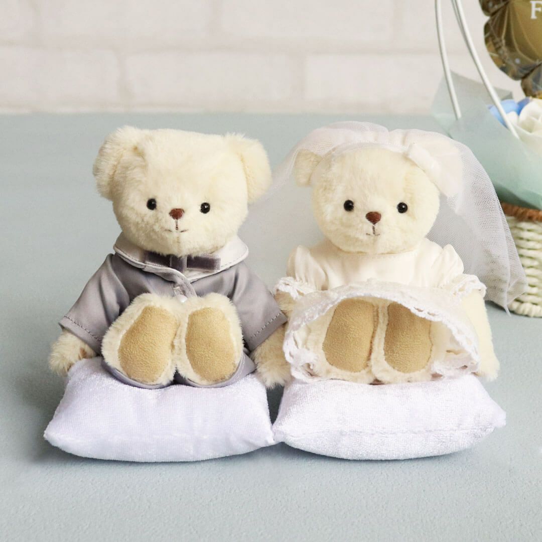 ゲストをお迎えするウェルカムベアや、ご結婚・ご入籍の記念ギフトとしておすすめです。ドレス・和装・カジュアルなど、さまざまなスタイルのベアがございます。足裏にはおふたりのお名前や記念日を入れることも。