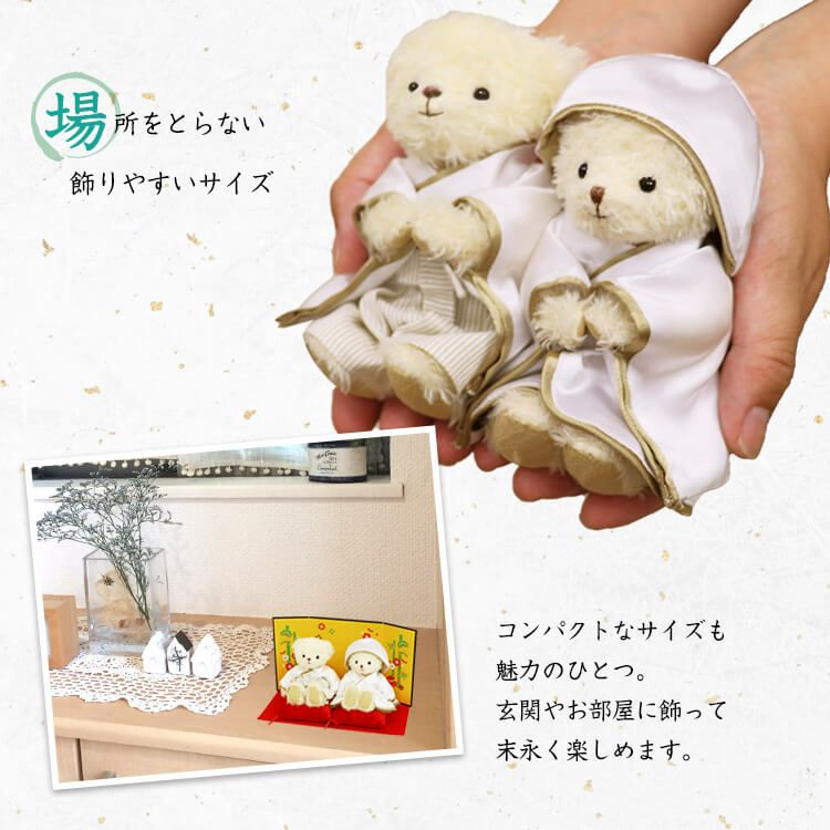 ふたりの幸せな瞬間に寄り添う、特別なテディベアをご用意しました。ドレス・和装・カジュアルなど、さまざまなスタイルのベアたちは、結婚式のウェルカムスペースやギフトにもぴったり。