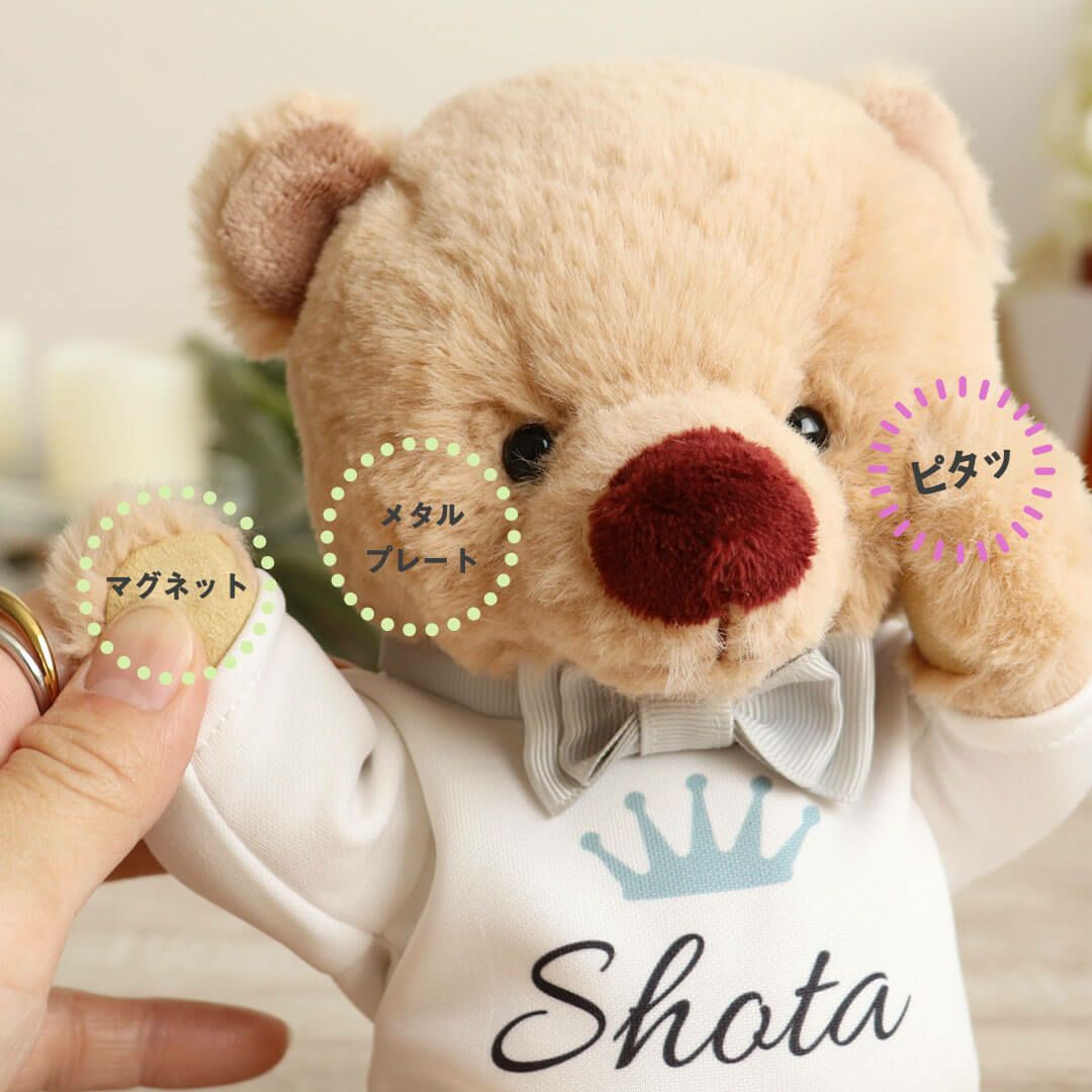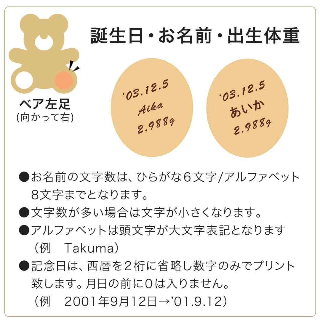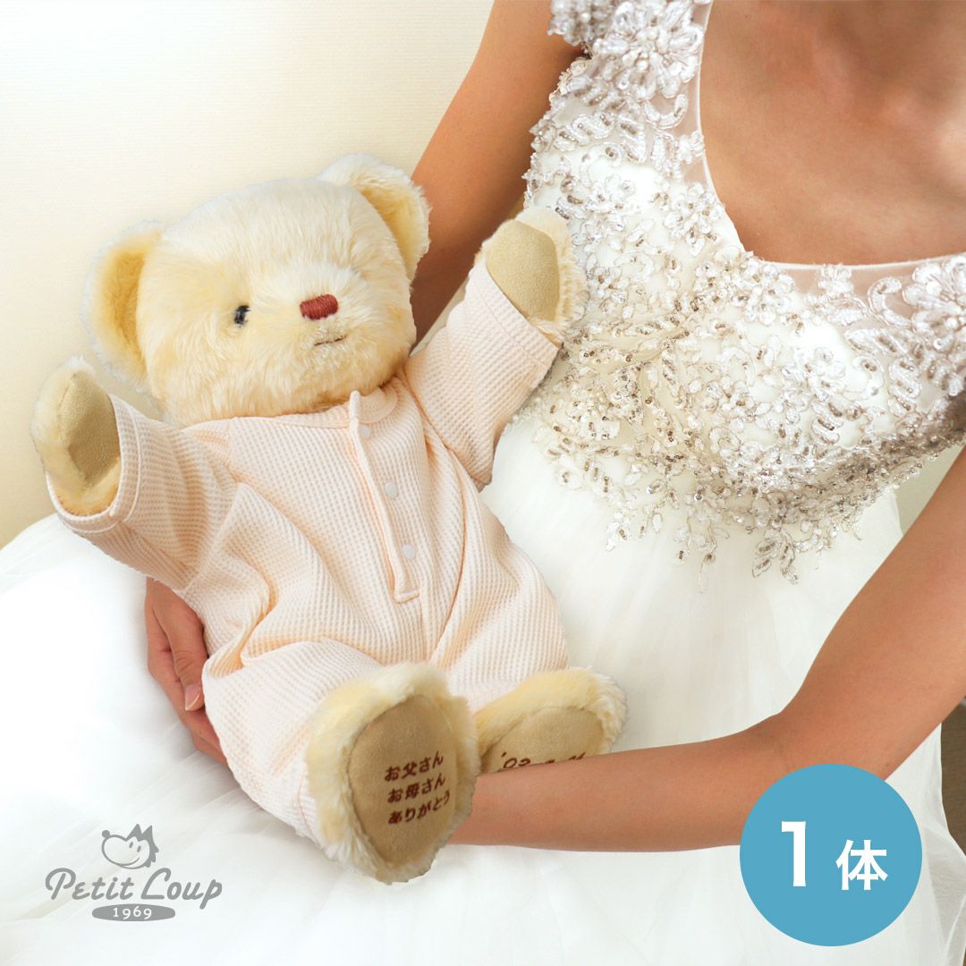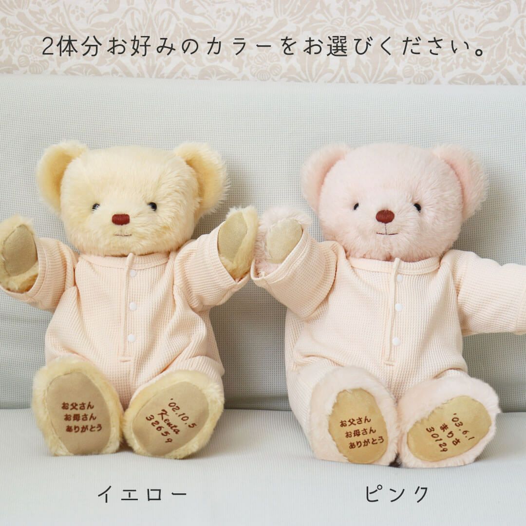 新郎新婦からご両親へ贈る体重ベア。感動の瞬間をお手伝いできるように国内で丁寧にお仕立てしています。足裏にはお名前・体重・生年月日の刺繍が入ります。