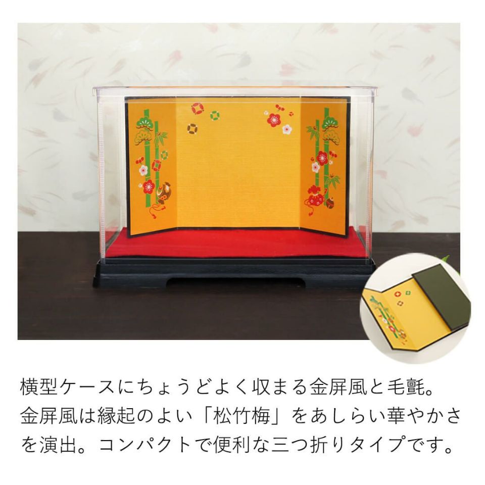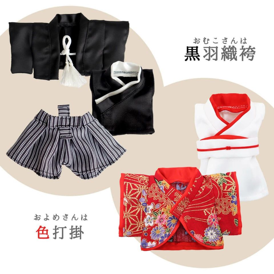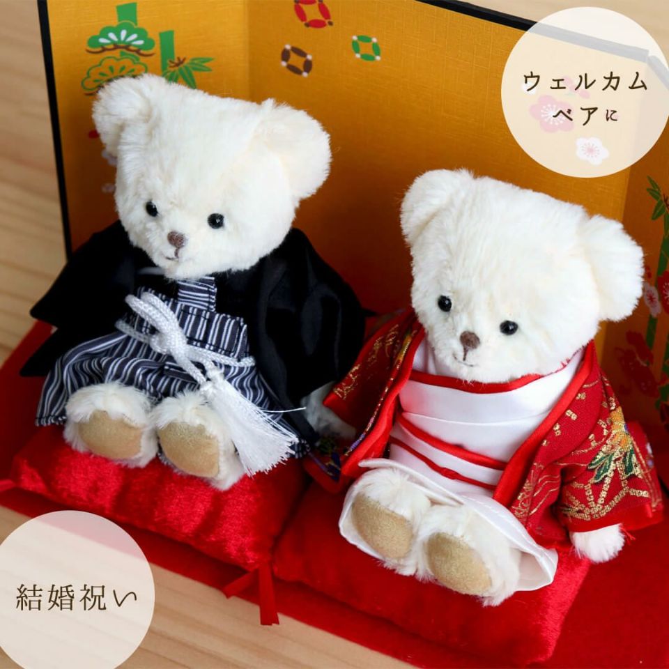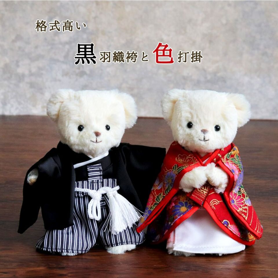 セット内容 結婚記念べア2体(黒羽織袴と色打掛着用)、座布団2枚、折りたたみケースセット(底板/天板/側面の3ピース構成)、三つ折り屏風、台紙(毛せん)