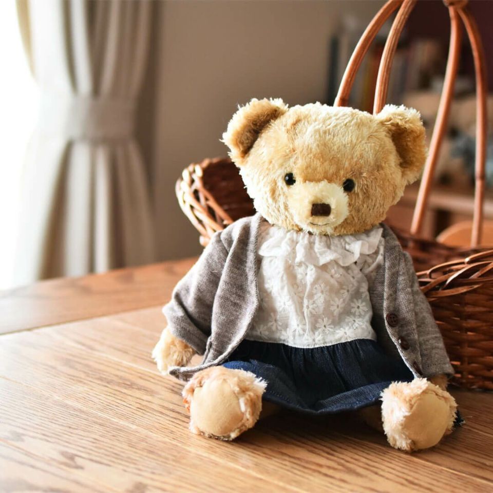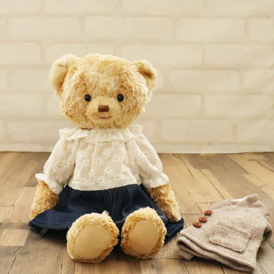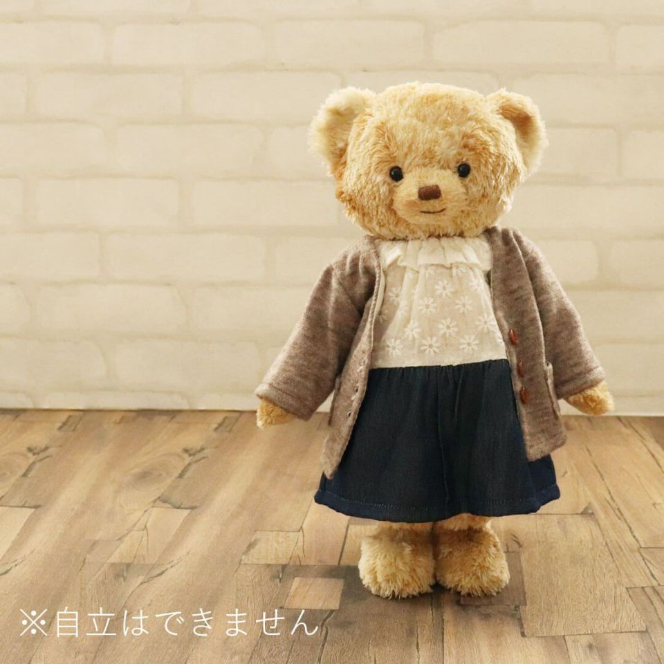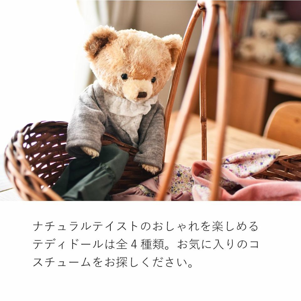 ふわふわの手触りのテディベアがナチュラルテイストのお洋服を着ておめかししました。ほどよい存在感でお部屋に飾っても、お子様へのプレゼントにもぴったりです。