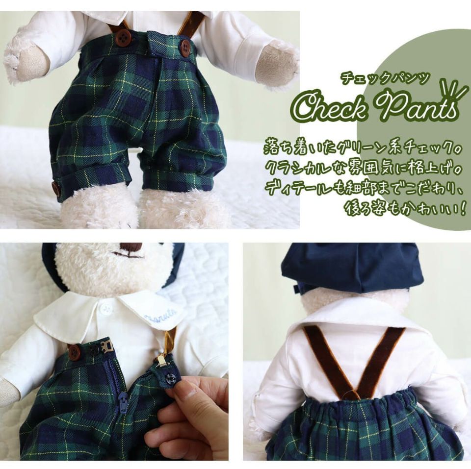 セット内容 コスチューム着せ込みテディベア×1体(お名前刺繍入りシャツ・サスペンダー付チェックパンツ・ベレー帽