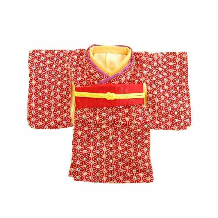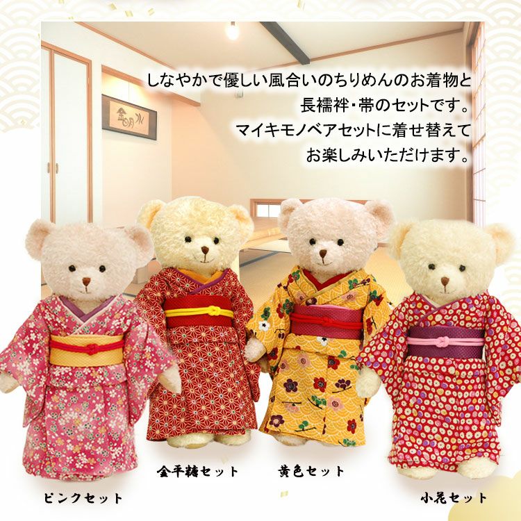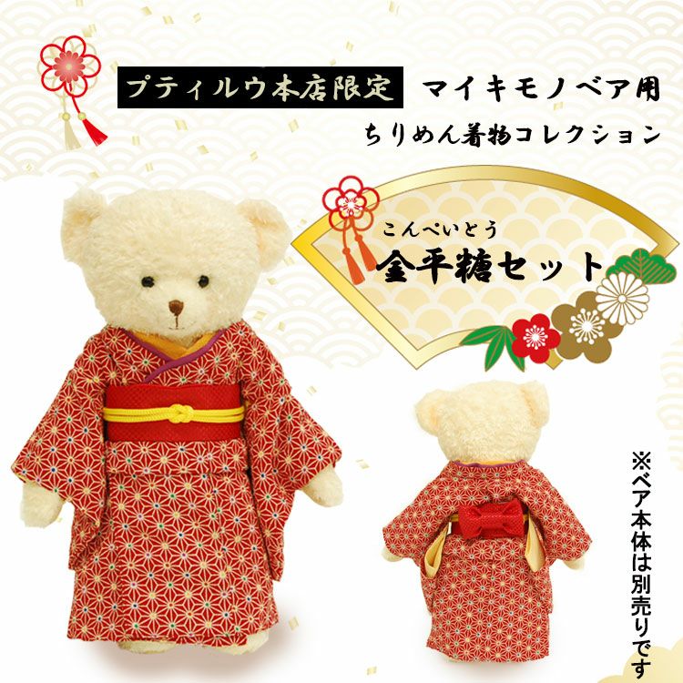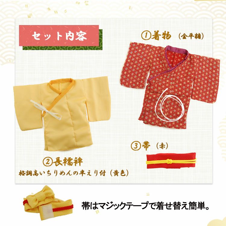 セット内容 ちりめん着物(金平糖)・長襦袢(黄)・帯(赤)