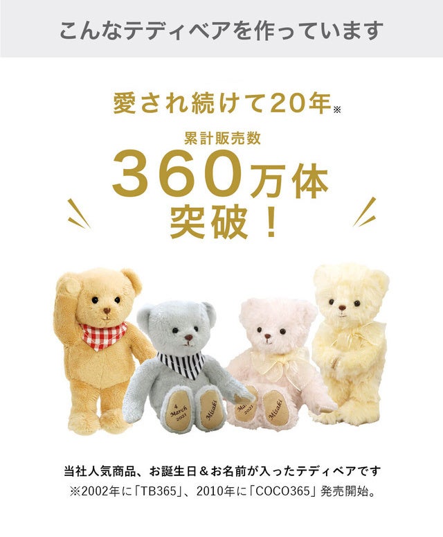 誕生日が足裏に記された誕生日ベアや、還暦祝いや米寿祝いに贈る長寿のお祝いテディベアなど、