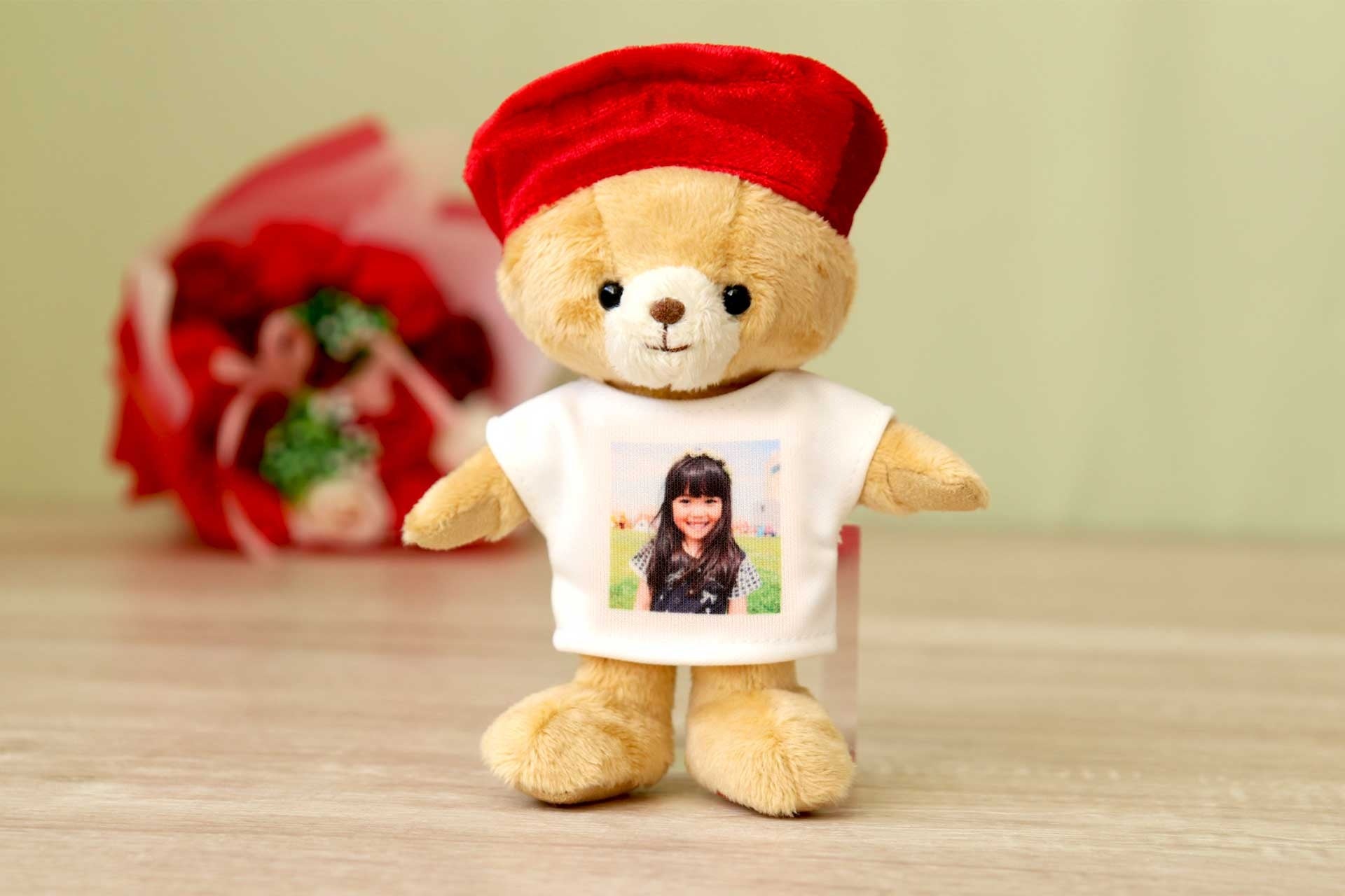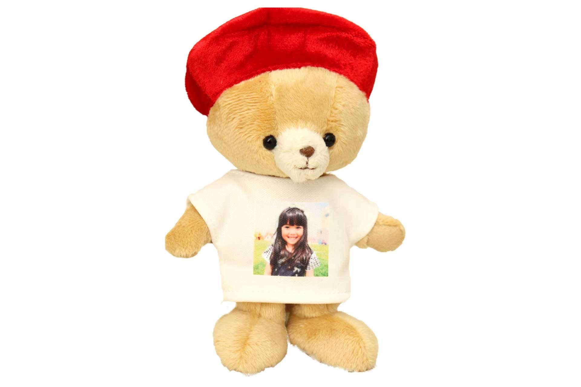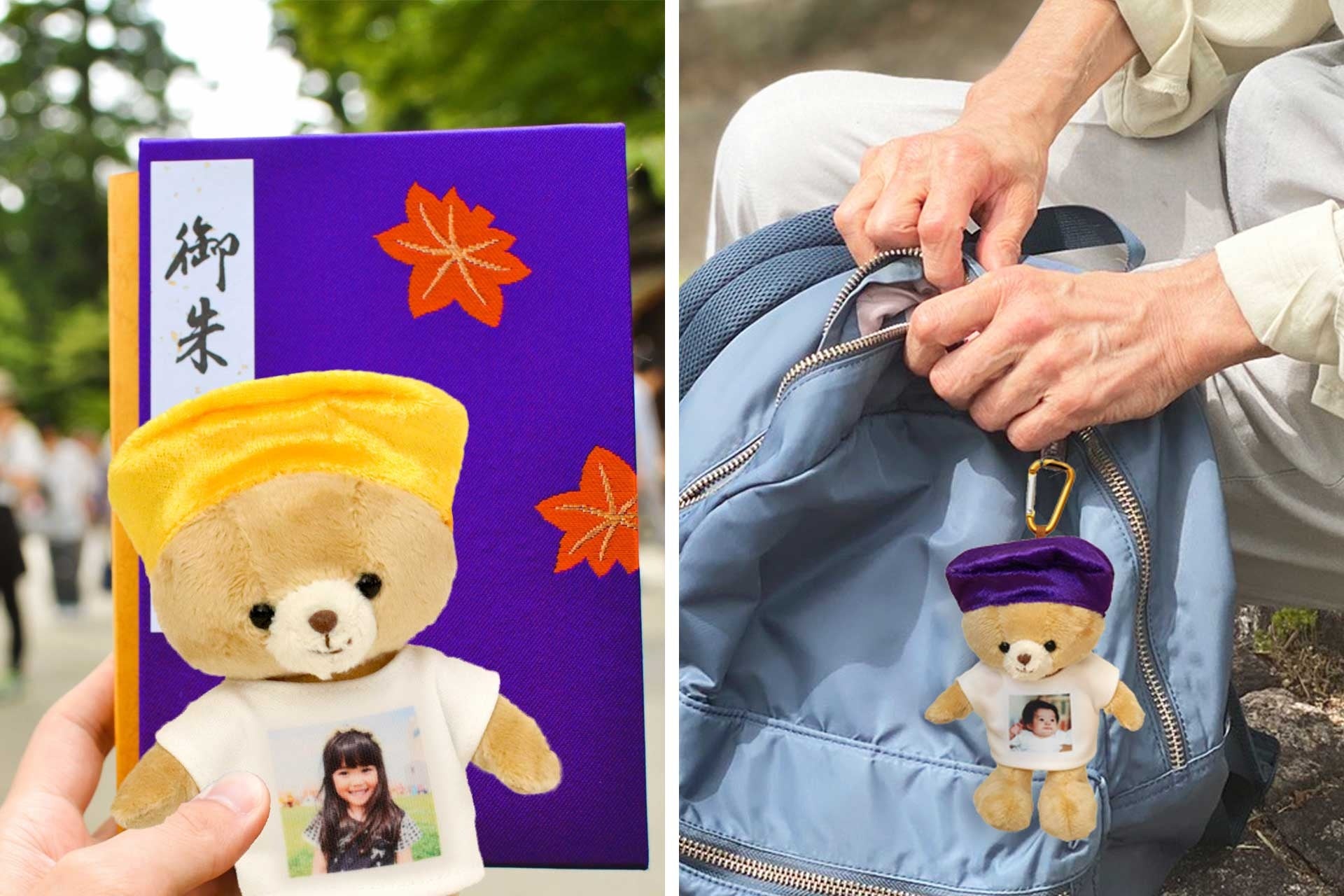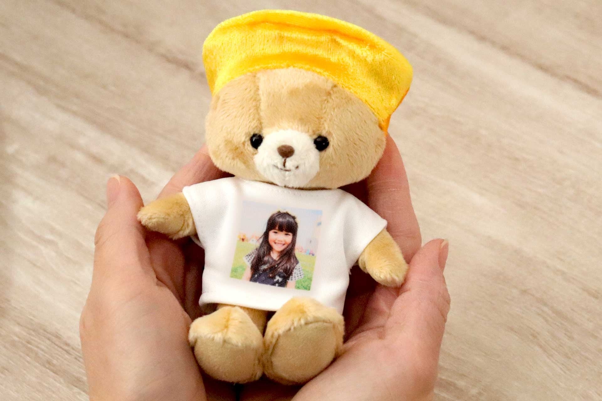 「元気長寿オマモリまごベア」は、お孫さんの写真入りTシャツを着たテディベア。お孫さんと一緒にお出かけ気分を味わえる小さなマスコットテディベアです。